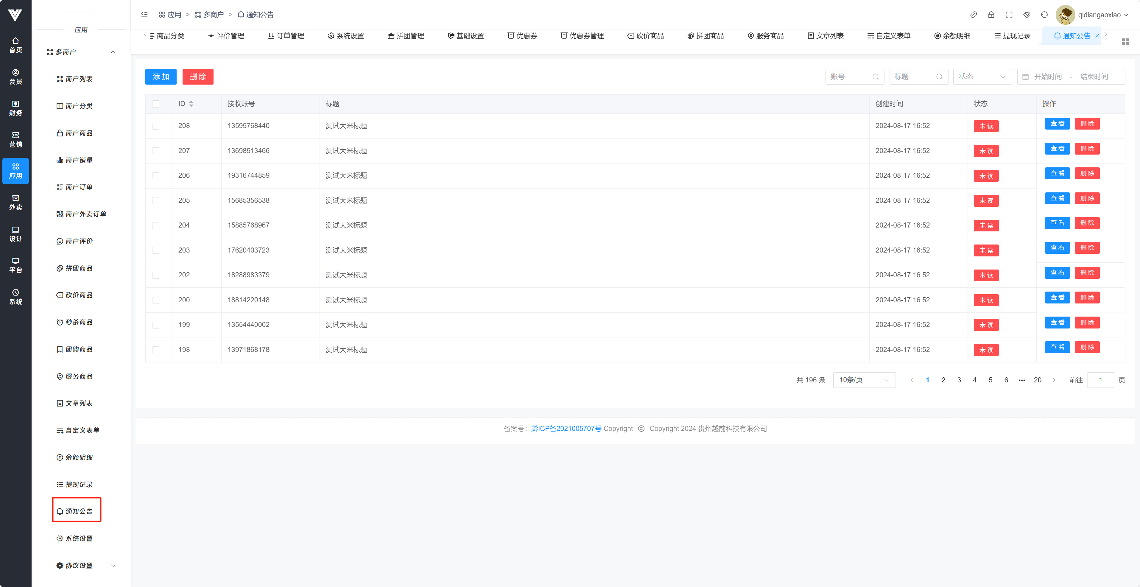 **通知公告** 给所有商家发送一条通知公告,如图所示