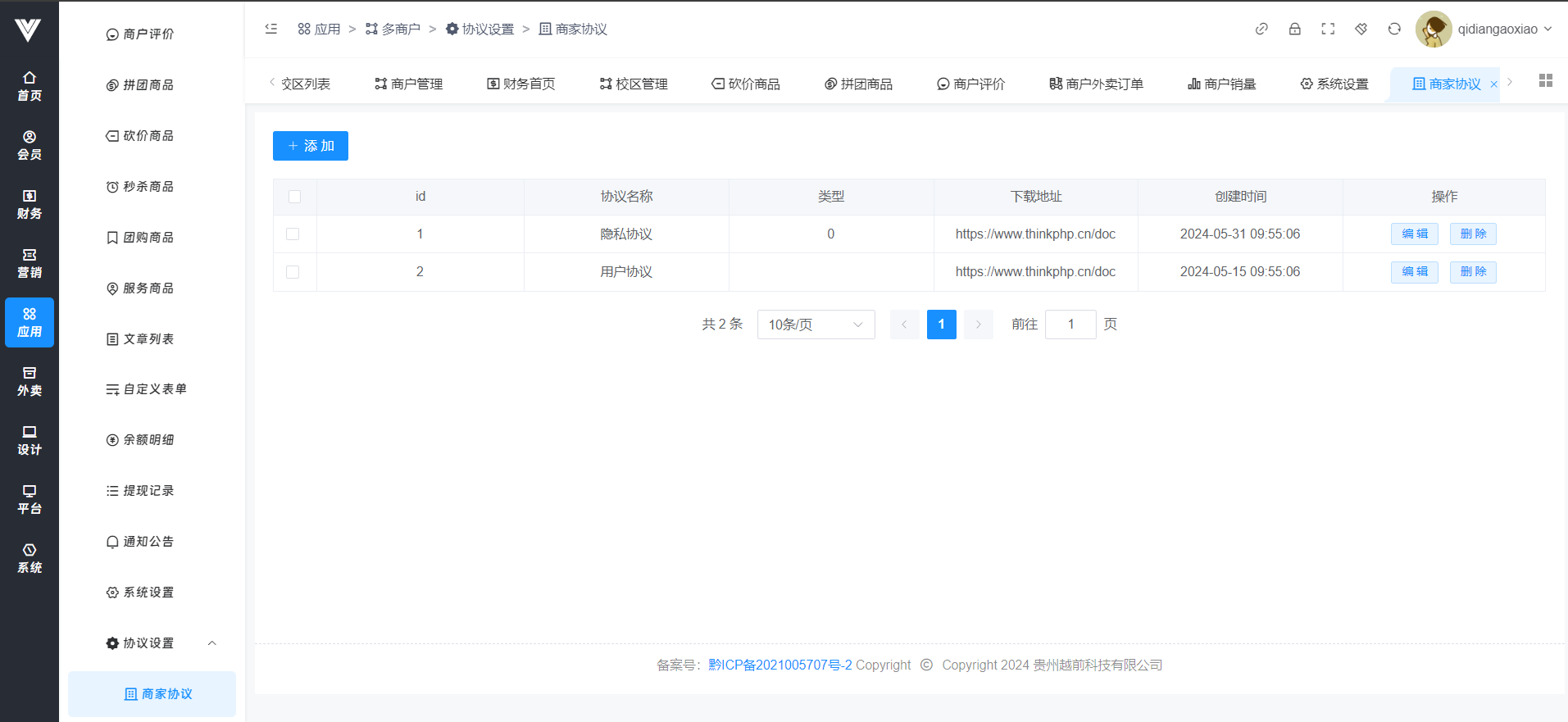 **协议设置** 此处协议设置是设置商家端隐私协议和用户协议所指向的链接,如图所示