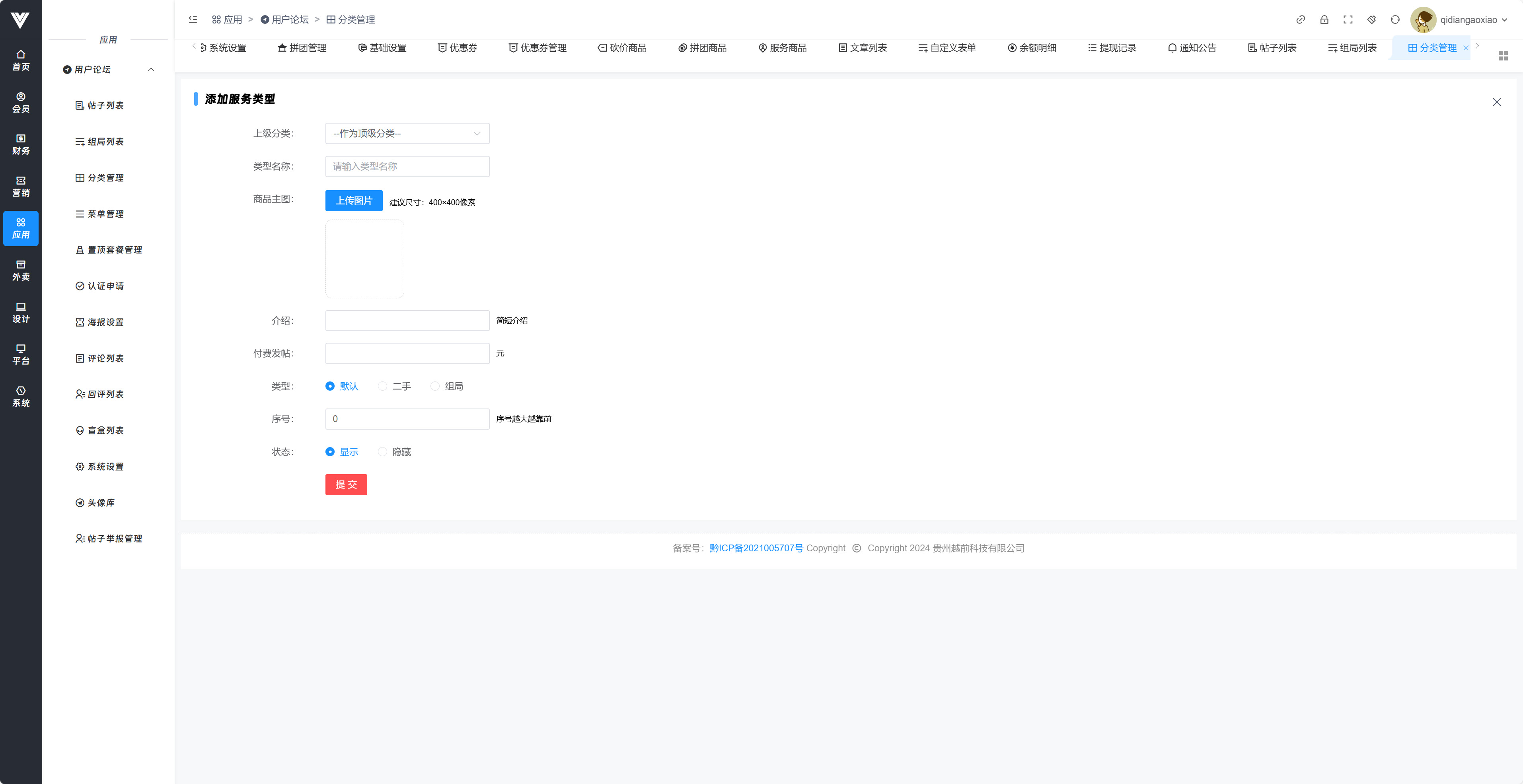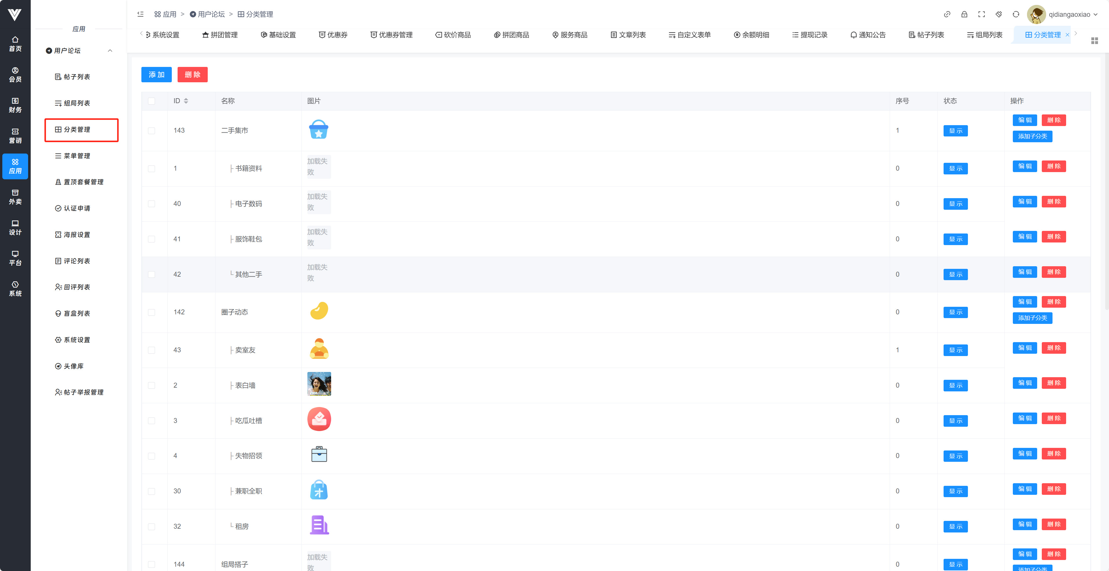 **分类管理** 设置论坛中用户发帖的分类   可以选择是否是顶级分类或者某一个顶级分类,然后设置分类名称和图标,对分类的介绍是有助于理解此分类的作用,在用户端并不会有实际显示界面显示,付费发帖可以设置在此分类下需要付多少钱进行发帖,然后设置此类型是默认,二手,还是组局,用户在发帖时候的界面会有所不同,状态设置成隐藏之后就不会在用户端看到了