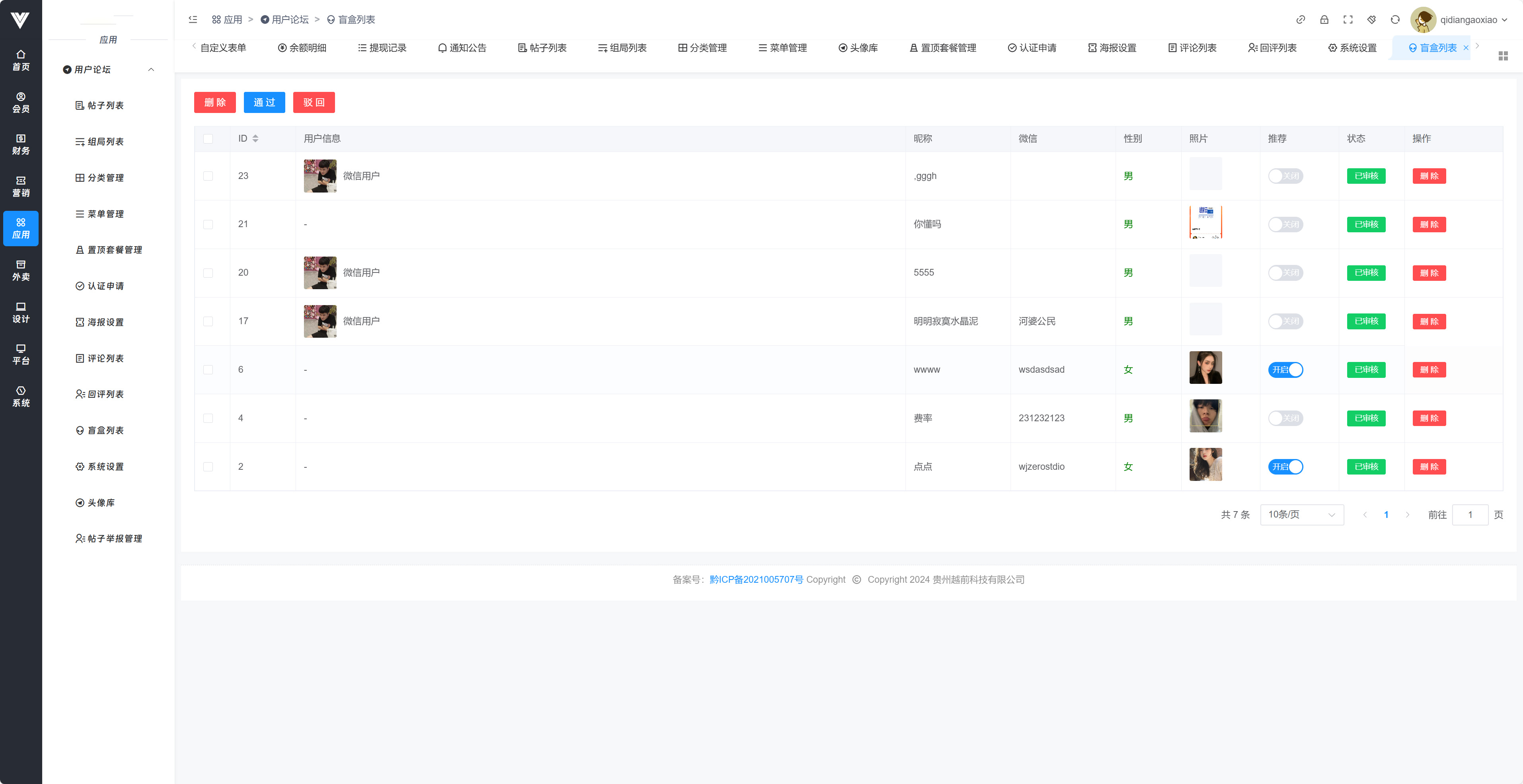 **盲盒列表** 审核用户在盲盒内提交的信息,审核通过之后用户提交的信息会出现在盲盒内进行显示,可以进行通过和驳回还有删除操作