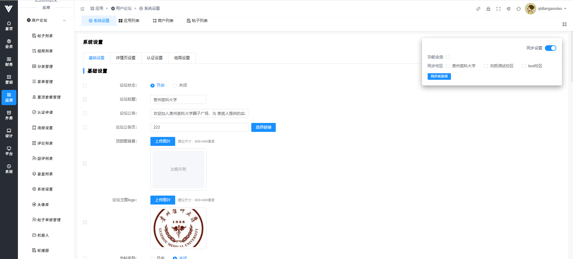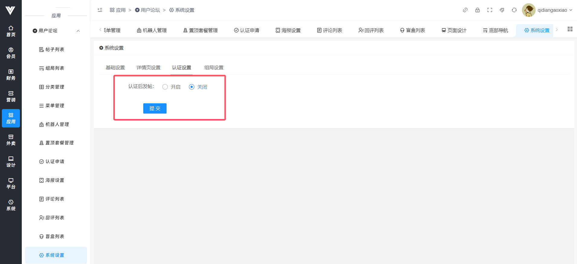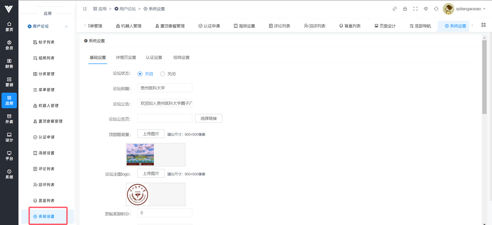 **系统设置** 在此处设置关于用户论坛的一系列相关设置  基础设置内是对帖子、评论、还有论坛的基础信息进行设置  现在对基础设置项进行说明: 论坛状态点击关闭之后用户是无法点击进入论坛页面的 论坛标题,论坛公告,顶部图背景,论坛主图logo都是在点击进入论坛界面顶端显示的设置项,设置效果如下图所示  发帖奖励积分设置可以让用户发帖成功之后获得积分 发帖审核开启之后用户在发帖之后不会自动发布,需要在后台进行审核之后才可以显示在用户端论坛界面 评论审核开启之后,用户评论时候也是需要后台审核之后才会显示在用户端论坛界面 是否开启置顶套餐,开启之后用户在发帖时候可以选择置顶的套餐,发帖之后会进入支付套餐费用界面 是否开启百度文本审核,这里是需要设置百度审核,开启之后才会生效,具体方法参见重要配置→百度内容审核设置方法 浏览显示,关闭之后在用户端就看不见帖子的浏览数量 发帖条件,此处是进行设置哪些人可以在论坛进行发帖,注意,如果选择了所有人,那么后面再选择其他的也不会生效,所有人都可以发帖 认证后成为的会员等级id,开启认证后发帖,用户认证通过之后会员等级会自动变成该id对应的等级,会员等级id在会员→等级及分销内进行查看 开启首页广告图,开启之后用户点击论坛会弹出一张你在下面首页广告图上传的图片,然后在首页广告图链接设置用户点击图片之后跳转的页面 盲盒设置是对盲盒模块进行设置管理的,可以设置每人总送的次数,设置用户每次增加匹配次数的价格,玩法介绍页就是盲盒页面玩法介绍会跳转的页面 详情页设置就是在用户点进帖子列表内出现的横幅广告,设置好广告的id  认证设置是设置是否需要认证成功之后才能发帖  认证设置是设置是否需要认证成功之后才能发帖  认证设置是设置是否需要认证成功之后才能发帖