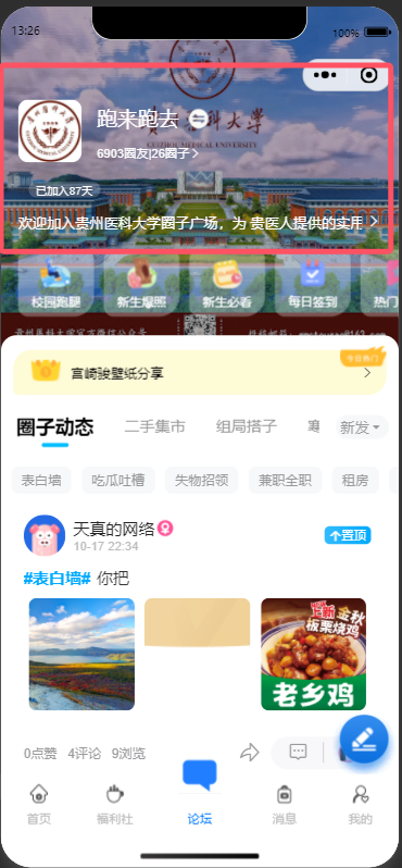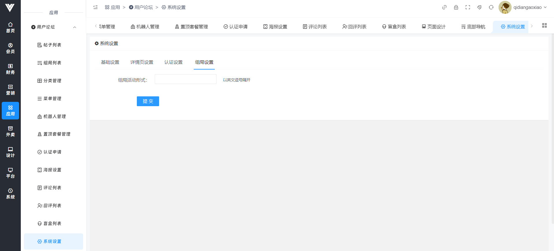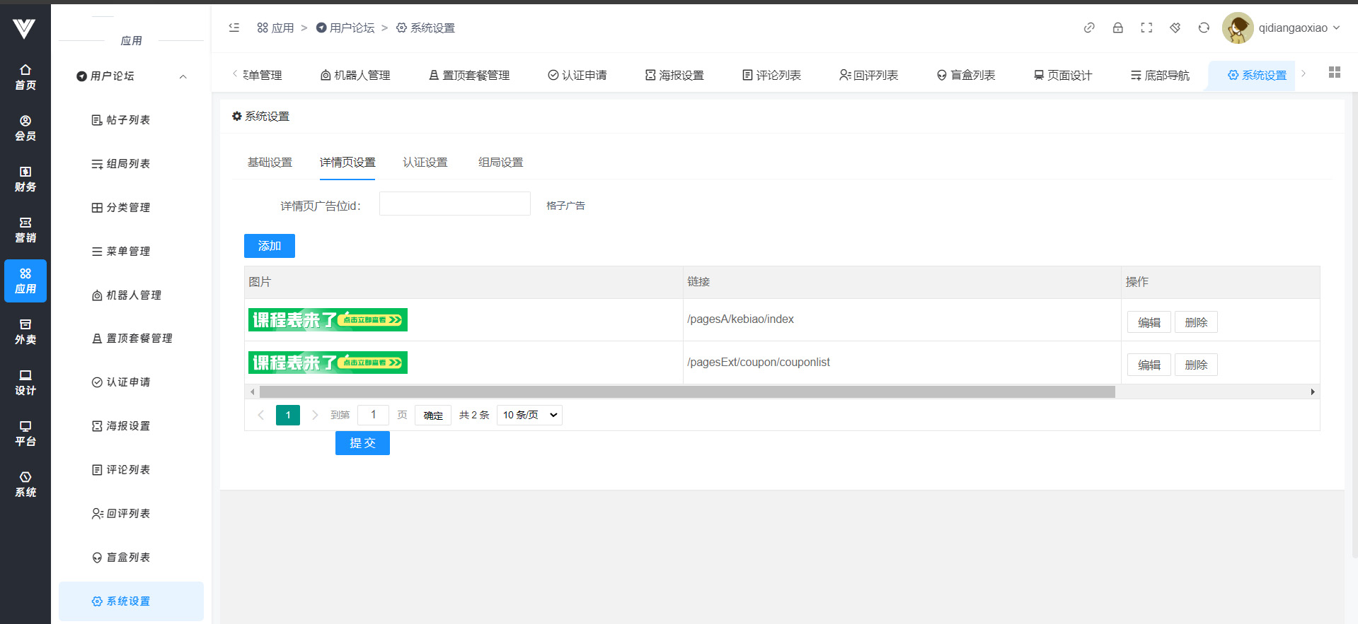 **系统设置** 在此处设置关于用户论坛的一系列相关设置  基础设置内是对帖子、评论、还有论坛的基础信息进行设置  现在对基础设置项进行说明: 论坛状态点击关闭之后用户是无法点击进入论坛页面的 论坛标题,论坛公告,顶部图背景,论坛主图logo都是在点击进入论坛界面顶端显示的设置项,设置效果如下图所示  发帖奖励积分设置可以让用户发帖成功之后获得积分 发帖审核开启之后用户在发帖之后不会自动发布,需要在后台进行审核之后才可以显示在用户端论坛界面 评论审核开启之后,用户评论时候也是需要后台审核之后才会显示在用户端论坛界面 是否开启置顶套餐,开启之后用户在发帖时候可以选择置顶的套餐,发帖之后会进入支付套餐费用界面 是否开启百度文本审核,这里是需要设置百度审核,开启之后才会生效,具体方法参见重要配置→百度内容审核设置方法 浏览显示,关闭之后在用户端就看不见帖子的浏览数量 发帖条件,此处是进行设置哪些人可以在论坛进行发帖,注意,如果选择了所有人,那么后面再选择其他的也不会生效,所有人都可以发帖 认证后成为的会员等级id,开启认证后发帖,用户认证通过之后会员等级会自动变成该id对应的等级,会员等级id在会员→等级及分销内进行查看 开启首页广告图,开启之后用户点击论坛会弹出一张你在下面首页广告图上传的图片,然后在首页广告图链接设置用户点击图片之后跳转的页面 盲盒设置是对盲盒模块进行设置管理的,可以设置每人总送的次数,设置用户每次增加匹配次数的价格,玩法介绍页就是盲盒页面玩法介绍会跳转的页面 详情页设置就是在用户点进帖子列表内出现的横幅广告,设置好广告的id  认证设置是设置是否需要认证成功之后才能发帖  认证设置是设置是否需要认证成功之后才能发帖  认证设置是设置是否需要认证成功之后才能发帖