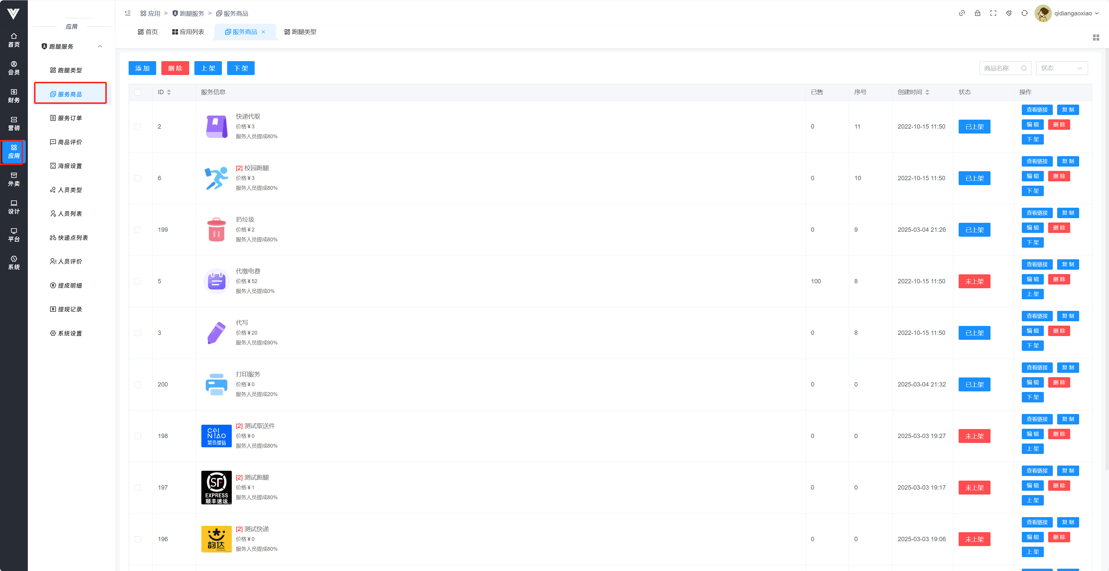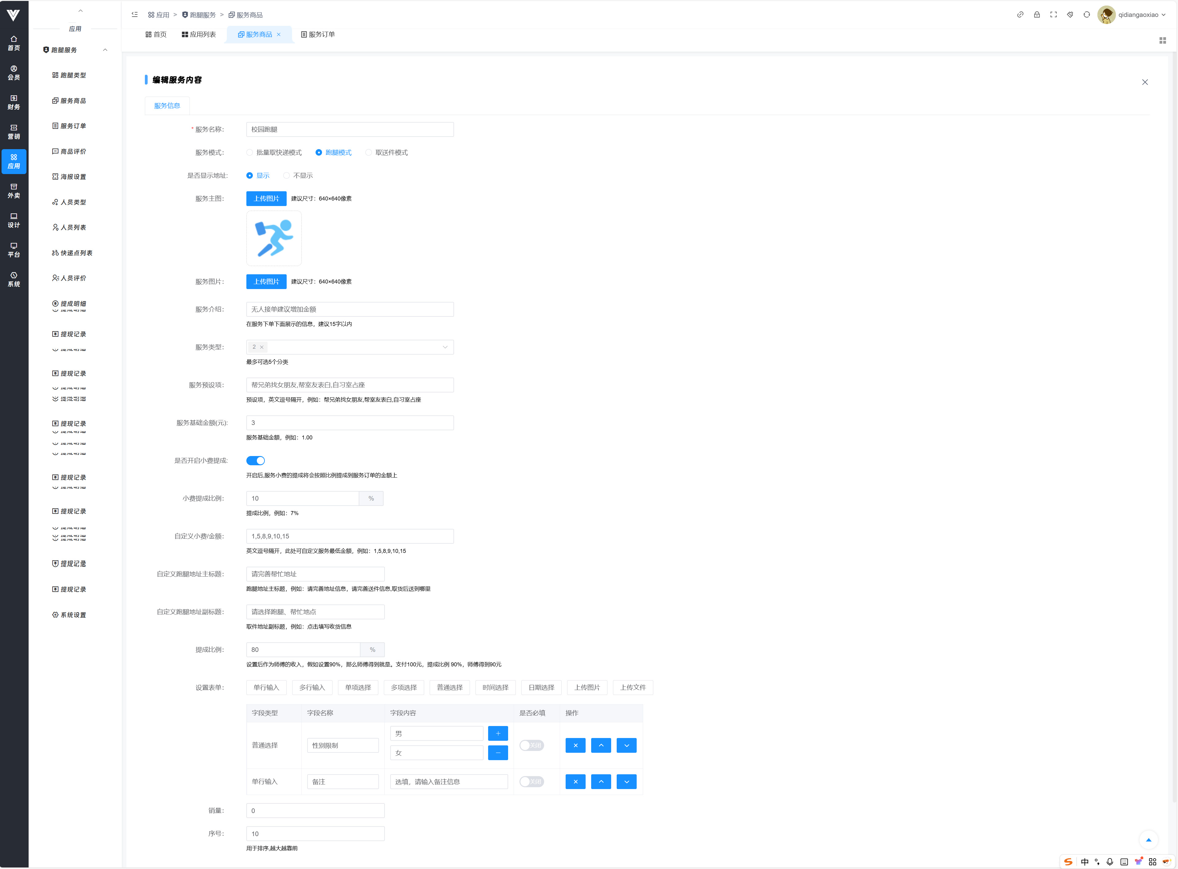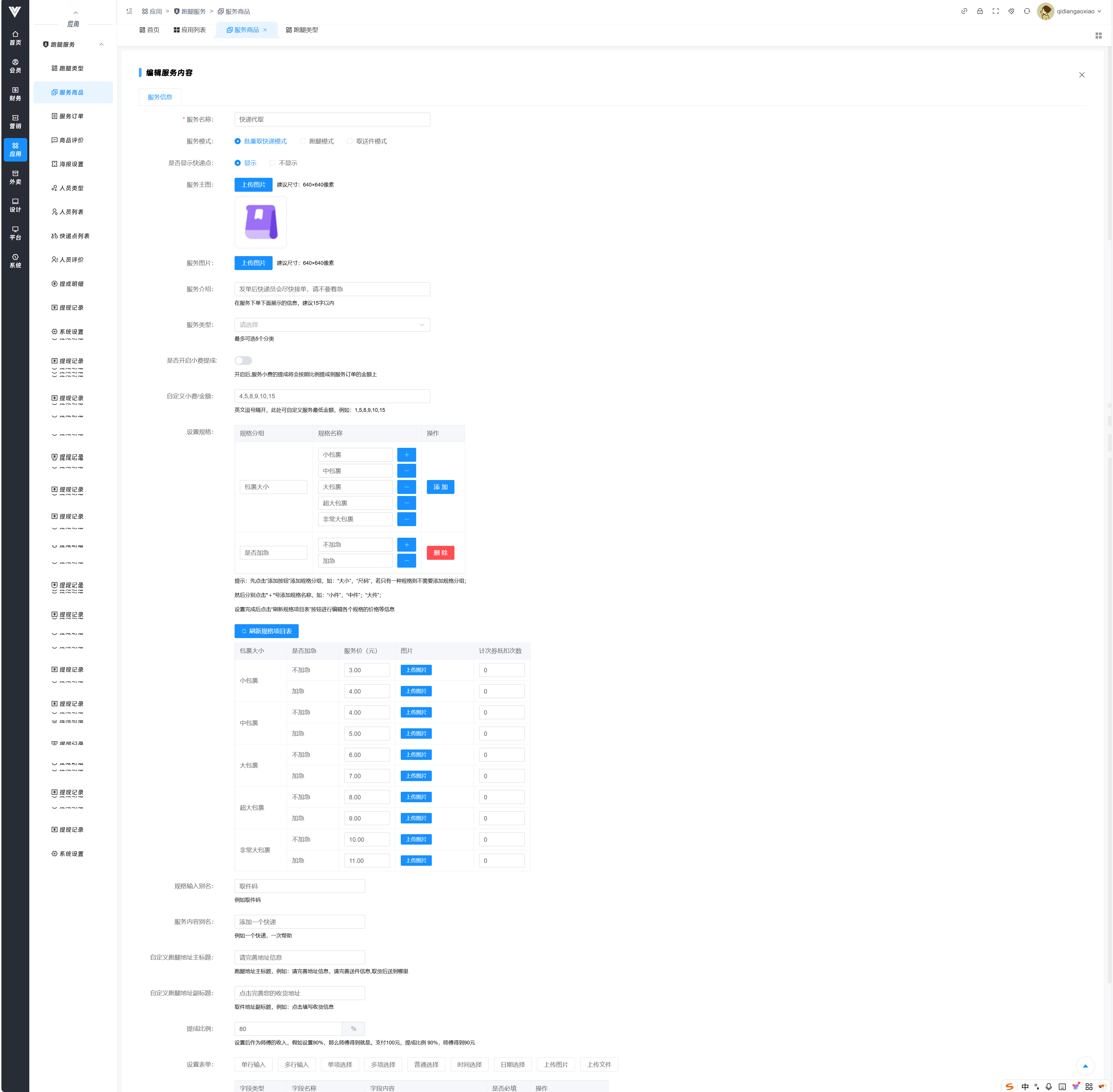 在此处添加跑腿对应的服务商品,有三种模式  第一种是批量取快递模式,具体设置项如下图所示  服务名称和模式不用多说 是否显示快递点如果不开启的话,在用户端小程序下这个服务商品时候不会显示出快递站点给用户选择 服务主图和服务图片则是关于这个商品的图片logo 服务介绍会显示在用户在此商品的下单页面的底部,用感叹号做标识 服务类型需要在左边跑腿类型内添加之后才可以选择,选择之后可以在设计页面按照分类显示 是否开启小费提成,开启之后可以设置对应的提成比例,如果用户付了5块的小费赏金,提成比例设置是10%,那么跑腿人员会获得5\*10%=0.5元 自定义小费金额可以自己设置用户在下单页面输入小费时候快捷选择,用英文逗号隔开 设置规格参考设置项下的小字说明,设置规格之后刷新一下下面的规格价目表,会自动变化,再在价目表内设置价格即可 规格输入别名设置之后会在前端的快递信息内会显示在一物一码的上面,作为规格使用 提成比例设置,假如设置90%,那么师傅得到就是。支付100元,提成比例 90%,师傅得到90元 设置表单,如果加了设置表单之后,用户在下单此商品时,必须要输入对应表单的内容,具体效果可以设置后去小程序查看 其余设置不再赘述 第二种是跑腿模式,具体设置项如下图所示  现就特别的设置作说明 服务基础金额,设置服务基础金额之后,用户下单时基础金额是包含在内的,用来防止有些竞争对手恶意无成本下单 第三种是取送件模式,具体设置项如下图所示