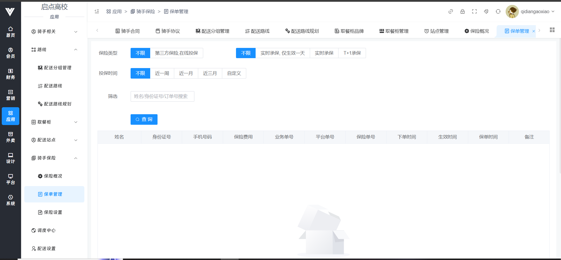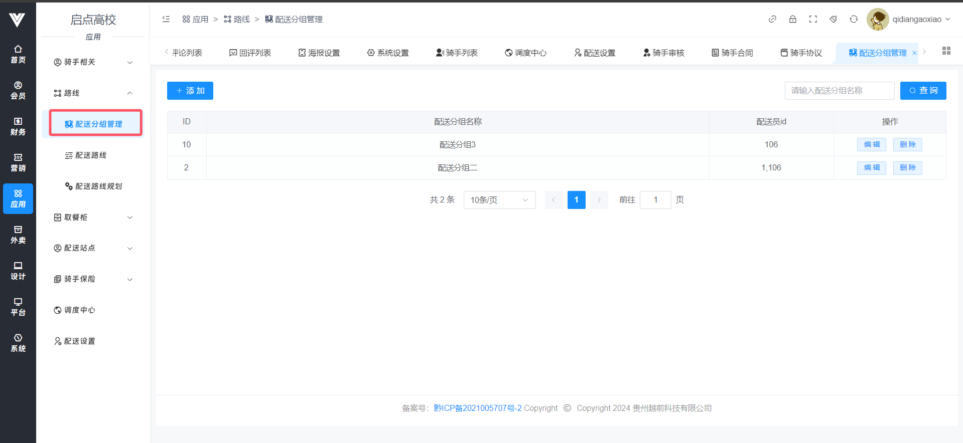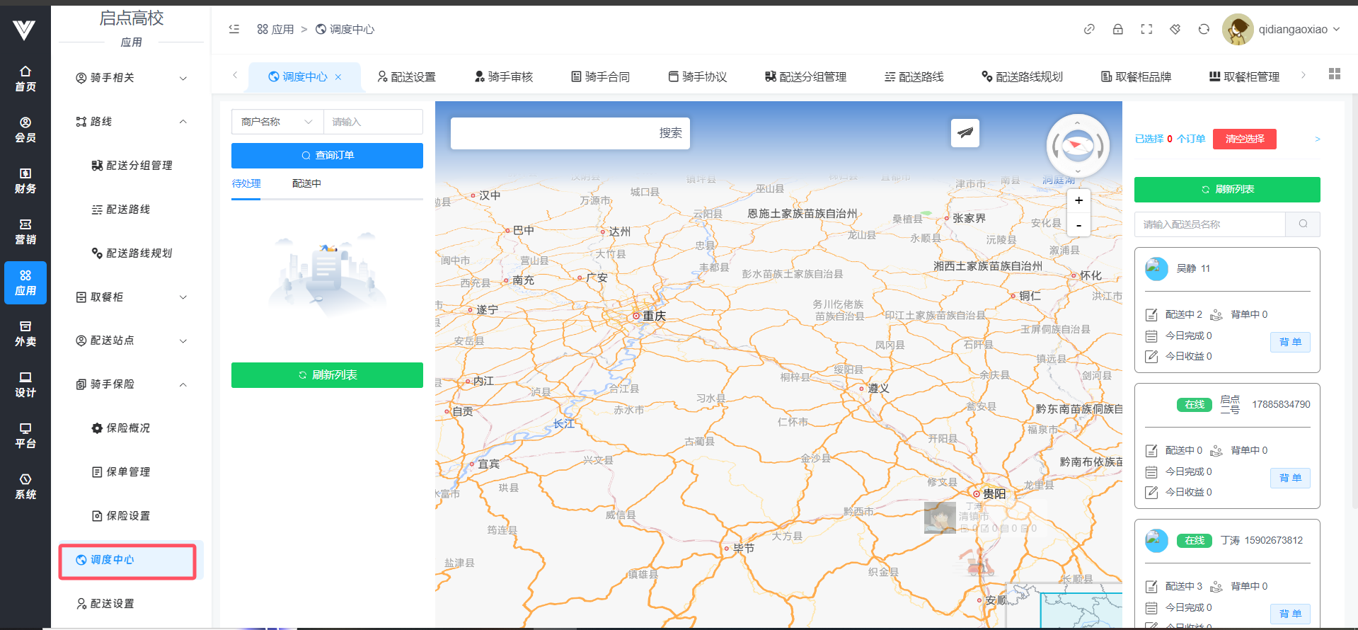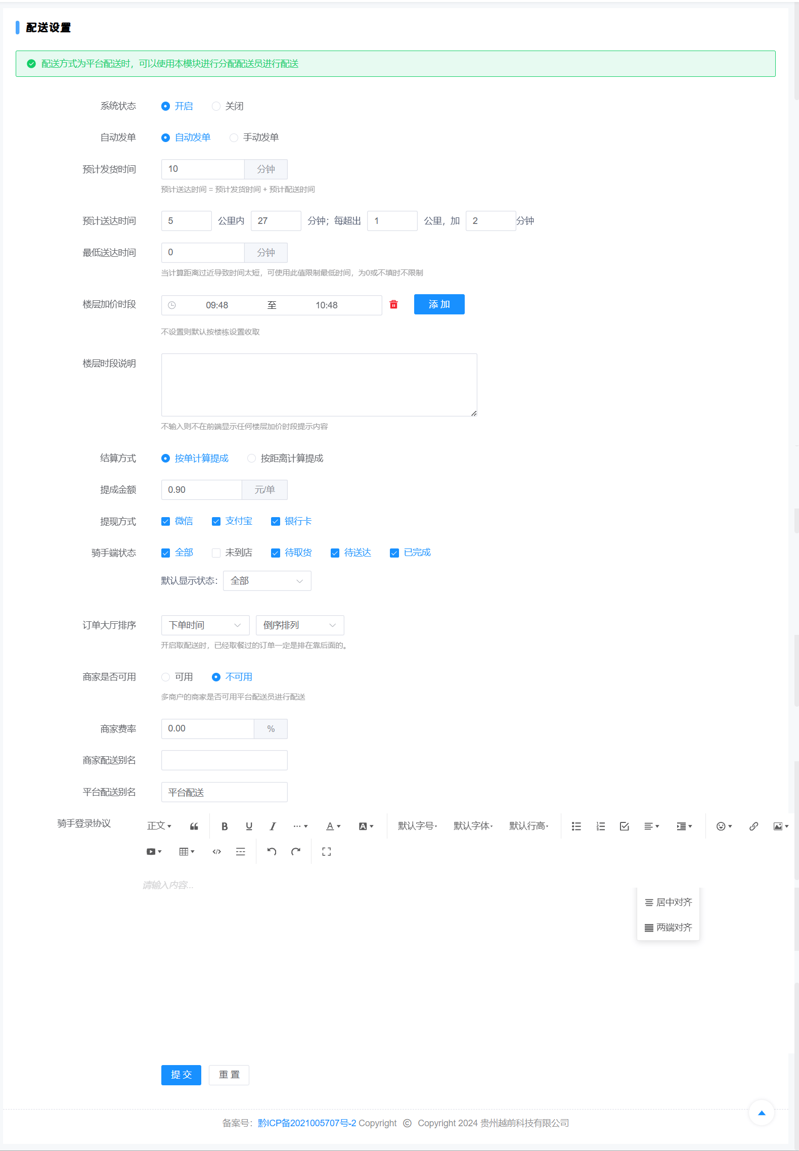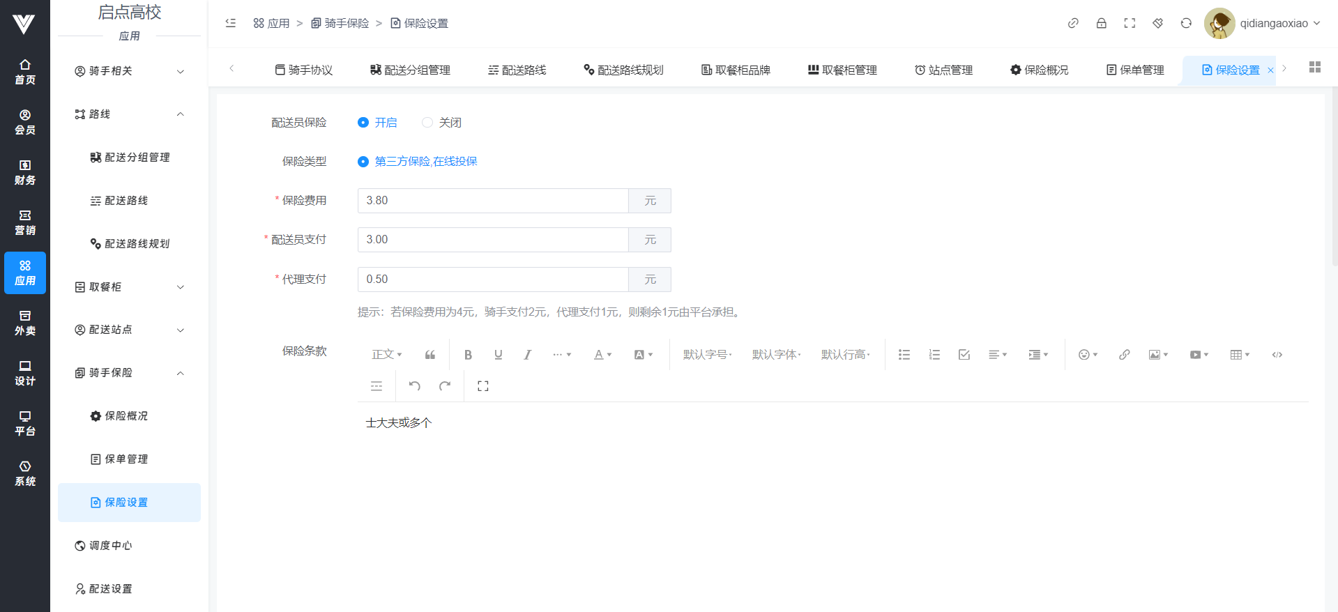 **平台配送** 功能:给多段配送和单独配送进行设置  **1.骑手相关** 骑手列表内可以查看和审核骑手签署合同的签名,也能查看编辑骑手部分信息,刚还可以手动添加骑手  手动添加骑手如下 输入骑手的姓名,手机号,再设置个密码,会员id可以自动获取,前提是骑手已经进入登录过用户端了,就会根据手机号自动匹配到会员id,余额默认为0,点击提交即可添加一名骑手  骑手审核是用户在小程序入驻骑手后,在此审核  骑手合同可以自定义合同内容和签署界面的文字  骑手协议内可以设置关于骑手的各项协议,可在骑手端查看  **2.路线** 配送分组管理是多段配送用到的,主要是给骑手分组,然后按组分配路段  配送路线也是用于多段配送,作用是把分好的路段组合成一条路线  配送路线规划是把从商家到用户之间分成几段进而进行路段分配和骑手组分配  **3.取餐柜** 取餐柜可以看作是个特殊的站点,设置好品牌和在管理内输入对应信息即可  **4.配送站点** 配送站点是管理在路线划分时创立的站点并为其分配区域  **5.骑手保险** 保险概况内可以看到保险的相关信息并进行充值,如图所示,需要注意的是充值时候两个都要充值,它会从不同账户里同时扣款安盟的账户扣三块,自己公司余额的那里会扣6毛  保单管理可以查看已经进行投保的保单  保险设置可以设置保险费用等,并进行保险文字说明的编辑  需要注意的是自动投保对取配送的第一段骑手不会生效,取配送的第一个骑手需要手动投保 **6.调度中心** 调度中心可以查看现在的订单状态,骑手状态等信息,进行订单调度管理  **7.配送设置** 在商家使用跟随瓶胚设置配送时,此处生效,可以设置骑手获得的余额是按单固定金额计算还是按照距离进行计算,手续费如何,还可以设置让购买商家商品时候商家承担一部分运费支付(商家费率),购买平台自营商城时候商家费率就不生效了,商家费率还会对跑腿模式的基础金额生效  楼层加价时间设置之后,在设置时间之内下单才会收取楼层加价费用 ### 注:多段配送具体设置和教程请参考骑手端操作手册