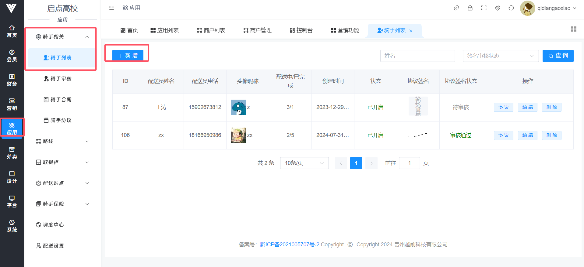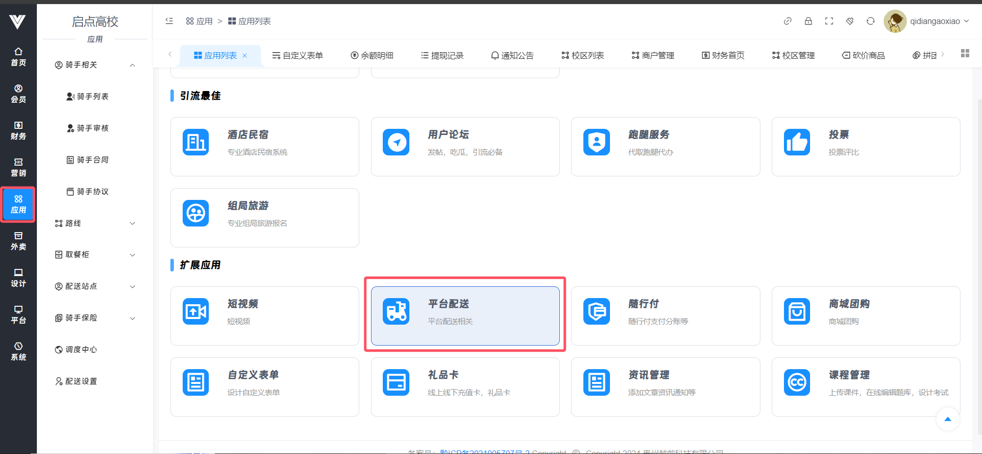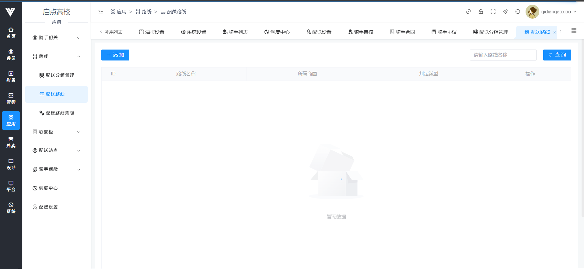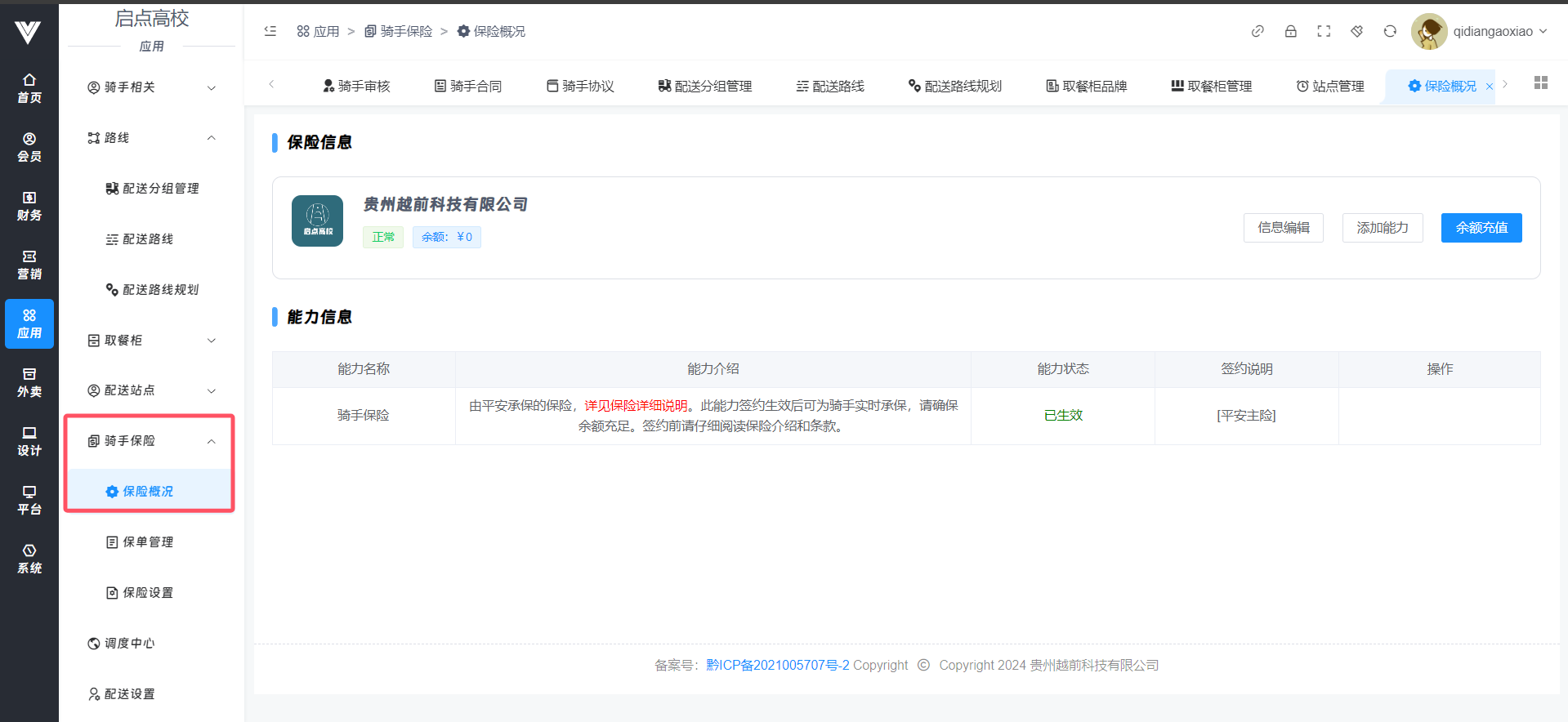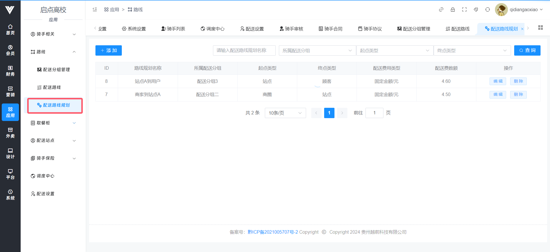 **平台配送** 功能:给多段配送和单独配送进行设置  **1.骑手相关** 骑手列表内可以查看和审核骑手签署合同的签名,也能查看编辑骑手部分信息,刚还可以手动添加骑手  手动添加骑手如下 输入骑手的姓名,手机号,再设置个密码,会员id可以自动获取,前提是骑手已经进入登录过用户端了,就会根据手机号自动匹配到会员id,余额默认为0,点击提交即可添加一名骑手  骑手审核是用户在小程序入驻骑手后,在此审核  骑手合同可以自定义合同内容和签署界面的文字  骑手协议内可以设置关于骑手的各项协议,可在骑手端查看  **2.路线** 配送分组管理是多段配送用到的,主要是给骑手分组,然后按组分配路段  配送路线也是用于多段配送,作用是把分好的路段组合成一条路线  配送路线规划是把从商家到用户之间分成几段进而进行路段分配和骑手组分配  **3.取餐柜** 取餐柜可以看作是个特殊的站点,设置好品牌和在管理内输入对应信息即可  **4.配送站点** 配送站点是管理在路线划分时创立的站点并为其分配区域  **5.骑手保险** 保险概况内可以看到保险的相关信息并进行充值,如图所示,需要注意的是充值时候两个都要充值,它会从不同账户里同时扣款安盟的账户扣三块,自己公司余额的那里会扣6毛  保单管理可以查看已经进行投保的保单  保险设置可以设置保险费用等,并进行保险文字说明的编辑  需要注意的是自动投保对取配送的第一段骑手不会生效,取配送的第一个骑手需要手动投保 **6.调度中心** 调度中心可以查看现在的订单状态,骑手状态等信息,进行订单调度管理  **7.配送设置** 在商家使用跟随瓶胚设置配送时,此处生效,可以设置骑手获得的余额是按单固定金额计算还是按照距离进行计算,手续费如何,还可以设置让购买商家商品时候商家承担一部分运费支付(商家费率),购买平台自营商城时候商家费率就不生效了,商家费率还会对跑腿模式的基础金额生效  楼层加价时间设置之后,在设置时间之内下单才会收取楼层加价费用 ### 注:多段配送具体设置和教程请参考骑手端操作手册