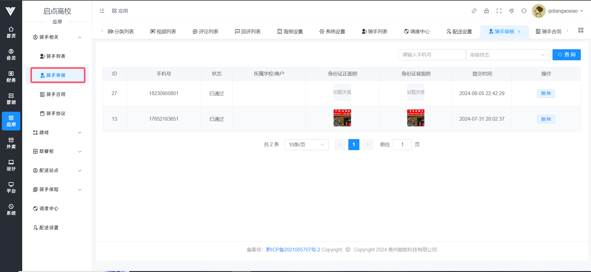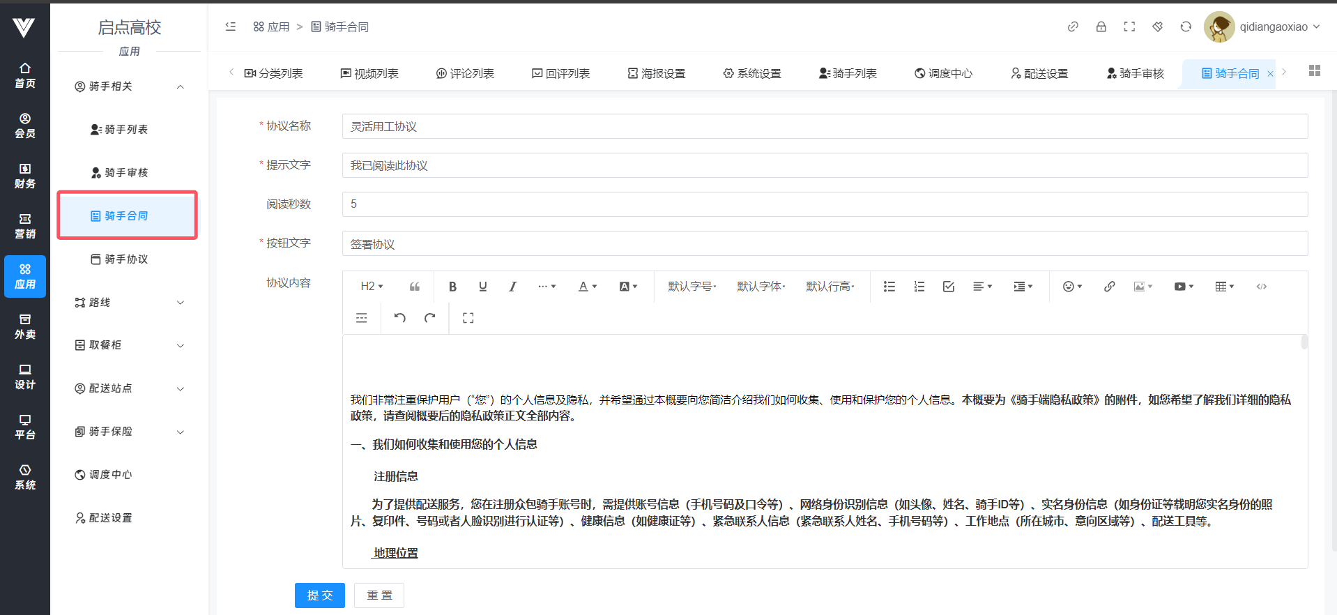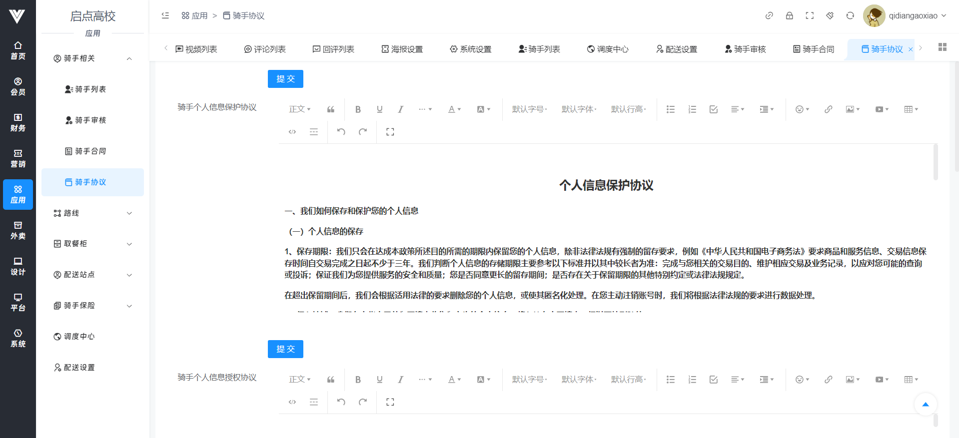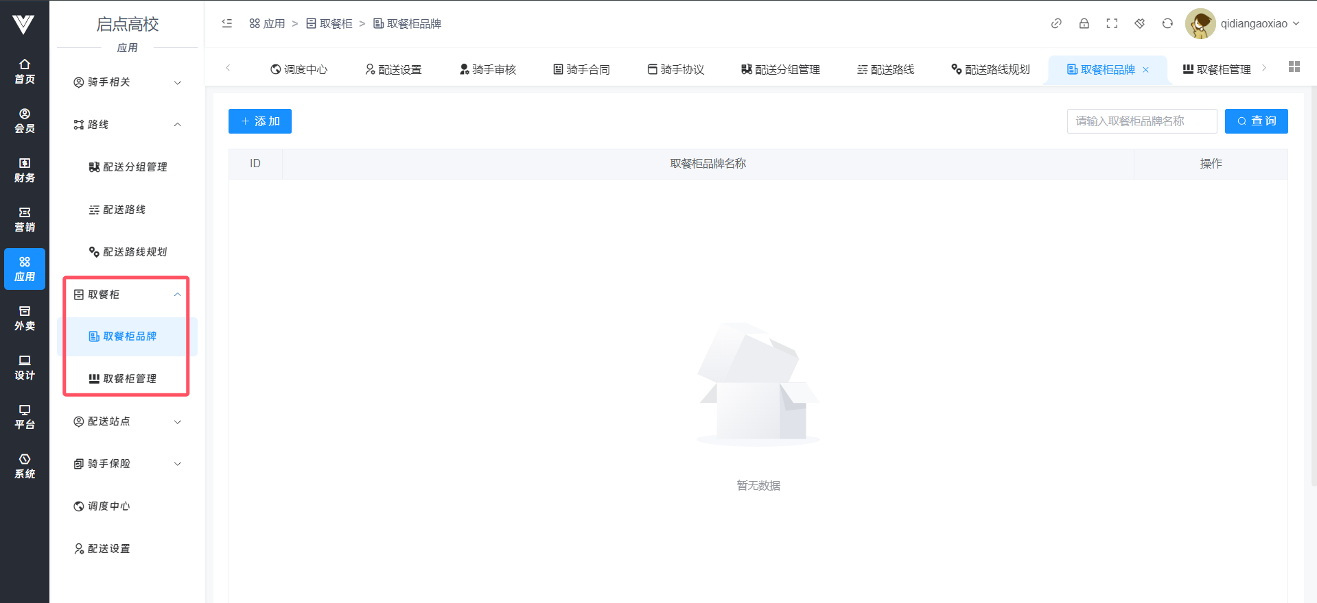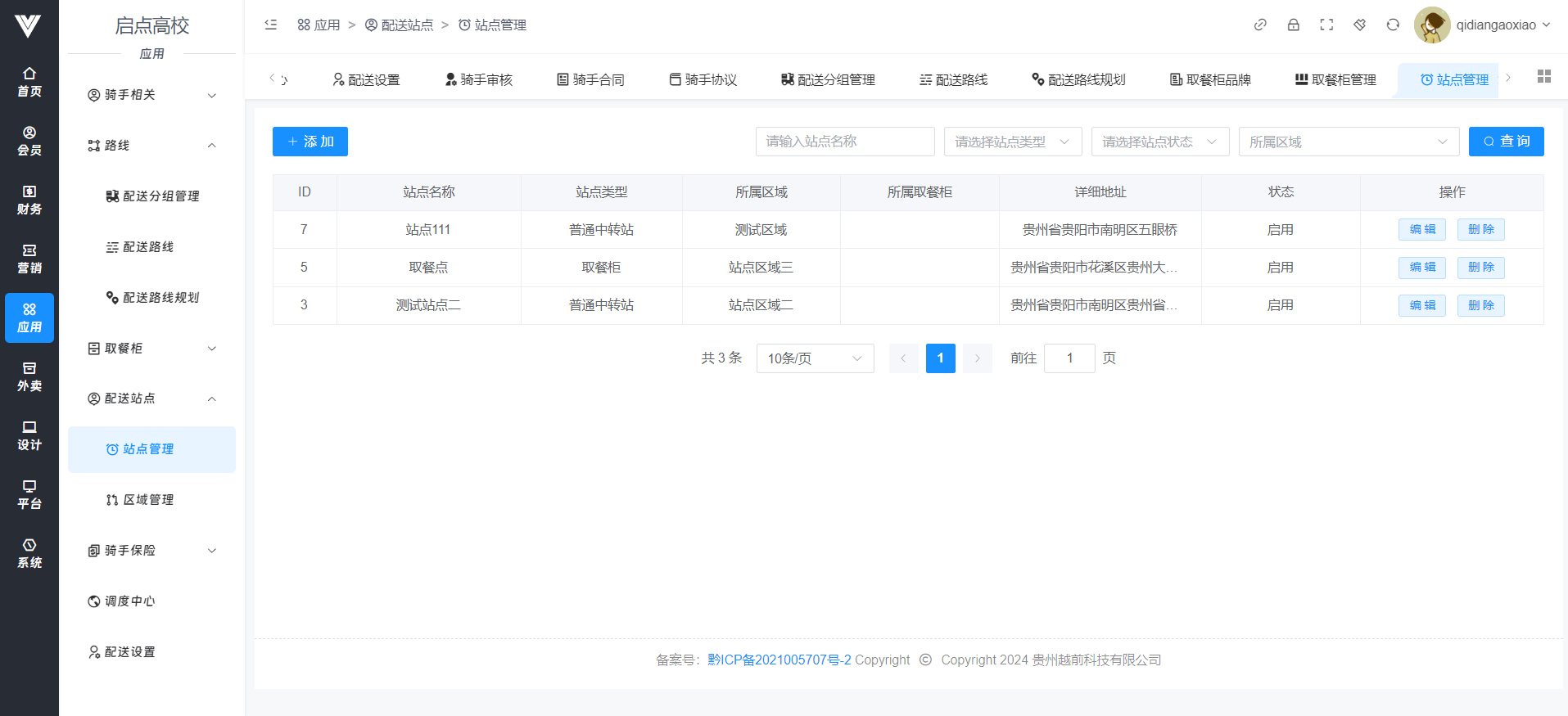 **平台配送** 功能:给多段配送和单独配送进行设置  **1.骑手相关** 骑手列表内可以查看和审核骑手签署合同的签名,也能查看编辑骑手部分信息,刚还可以手动添加骑手  手动添加骑手如下 输入骑手的姓名,手机号,再设置个密码,会员id可以自动获取,前提是骑手已经进入登录过用户端了,就会根据手机号自动匹配到会员id,余额默认为0,点击提交即可添加一名骑手  骑手审核是用户在小程序入驻骑手后,在此审核  骑手合同可以自定义合同内容和签署界面的文字  骑手协议内可以设置关于骑手的各项协议,可在骑手端查看  **2.路线** 配送分组管理是多段配送用到的,主要是给骑手分组,然后按组分配路段  配送路线也是用于多段配送,作用是把分好的路段组合成一条路线  配送路线规划是把从商家到用户之间分成几段进而进行路段分配和骑手组分配  **3.取餐柜** 取餐柜可以看作是个特殊的站点,设置好品牌和在管理内输入对应信息即可  **4.配送站点** 配送站点是管理在路线划分时创立的站点并为其分配区域  **5.骑手保险** 保险概况内可以看到保险的相关信息并进行充值,如图所示,需要注意的是充值时候两个都要充值,它会从不同账户里同时扣款安盟的账户扣三块,自己公司余额的那里会扣6毛  保单管理可以查看已经进行投保的保单  保险设置可以设置保险费用等,并进行保险文字说明的编辑  需要注意的是自动投保对取配送的第一段骑手不会生效,取配送的第一个骑手需要手动投保 **6.调度中心** 调度中心可以查看现在的订单状态,骑手状态等信息,进行订单调度管理  **7.配送设置** 在商家使用跟随瓶胚设置配送时,此处生效,可以设置骑手获得的余额是按单固定金额计算还是按照距离进行计算,手续费如何,还可以设置让购买商家商品时候商家承担一部分运费支付(商家费率),购买平台自营商城时候商家费率就不生效了,商家费率还会对跑腿模式的基础金额生效  楼层加价时间设置之后,在设置时间之内下单才会收取楼层加价费用 ### 注:多段配送具体设置和教程请参考骑手端操作手册