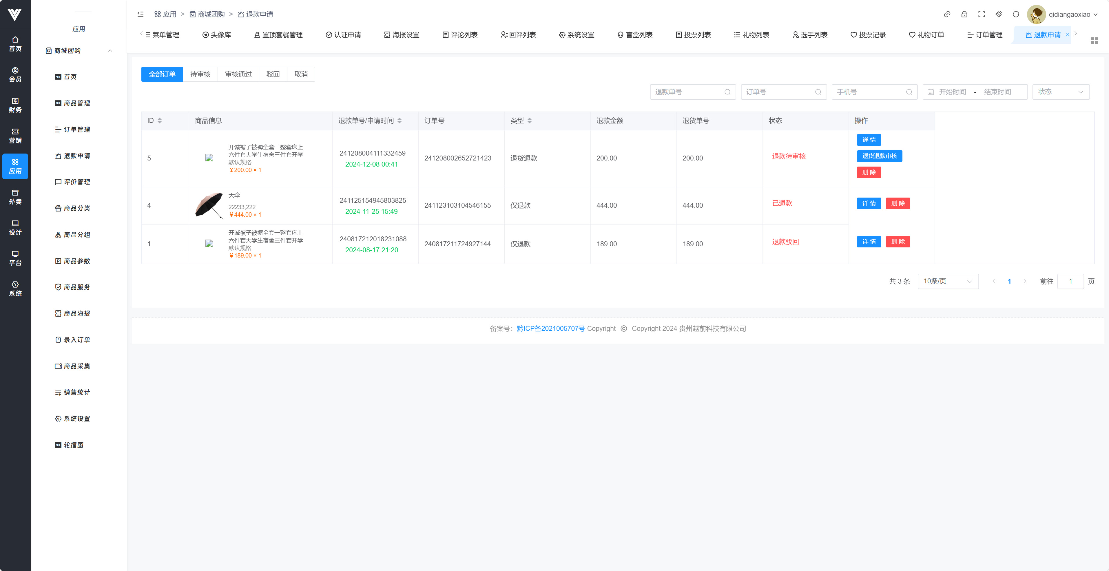 **退款申请** 此处可以显示用户发起的退款请求并进行处理