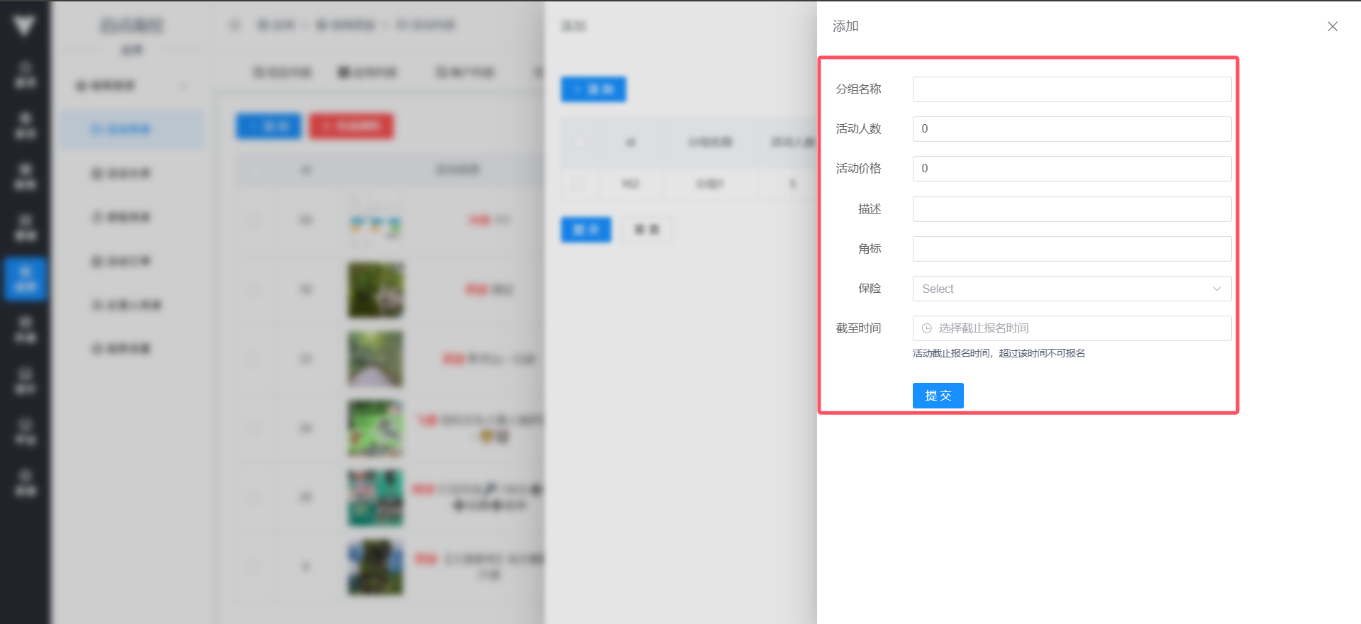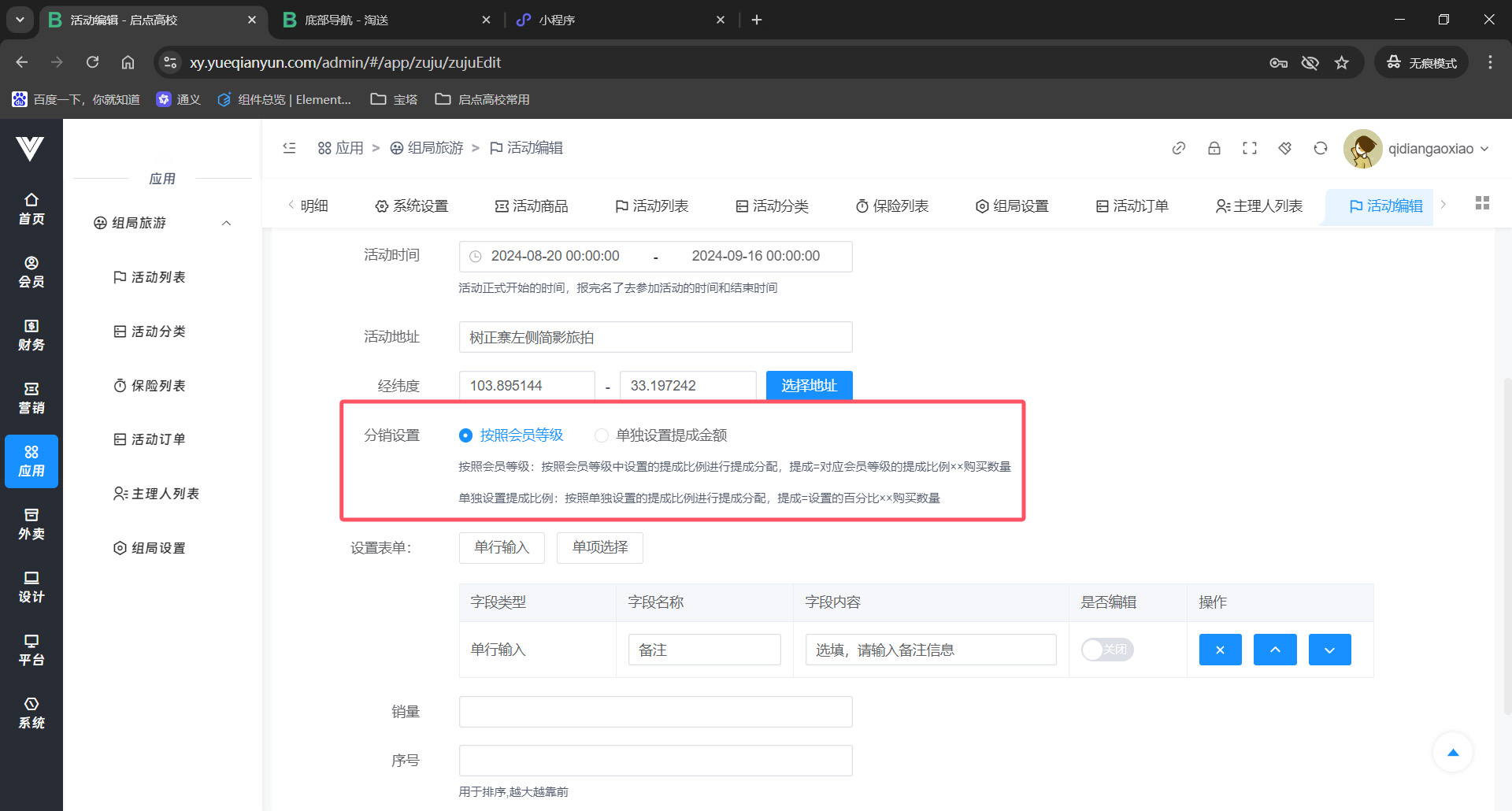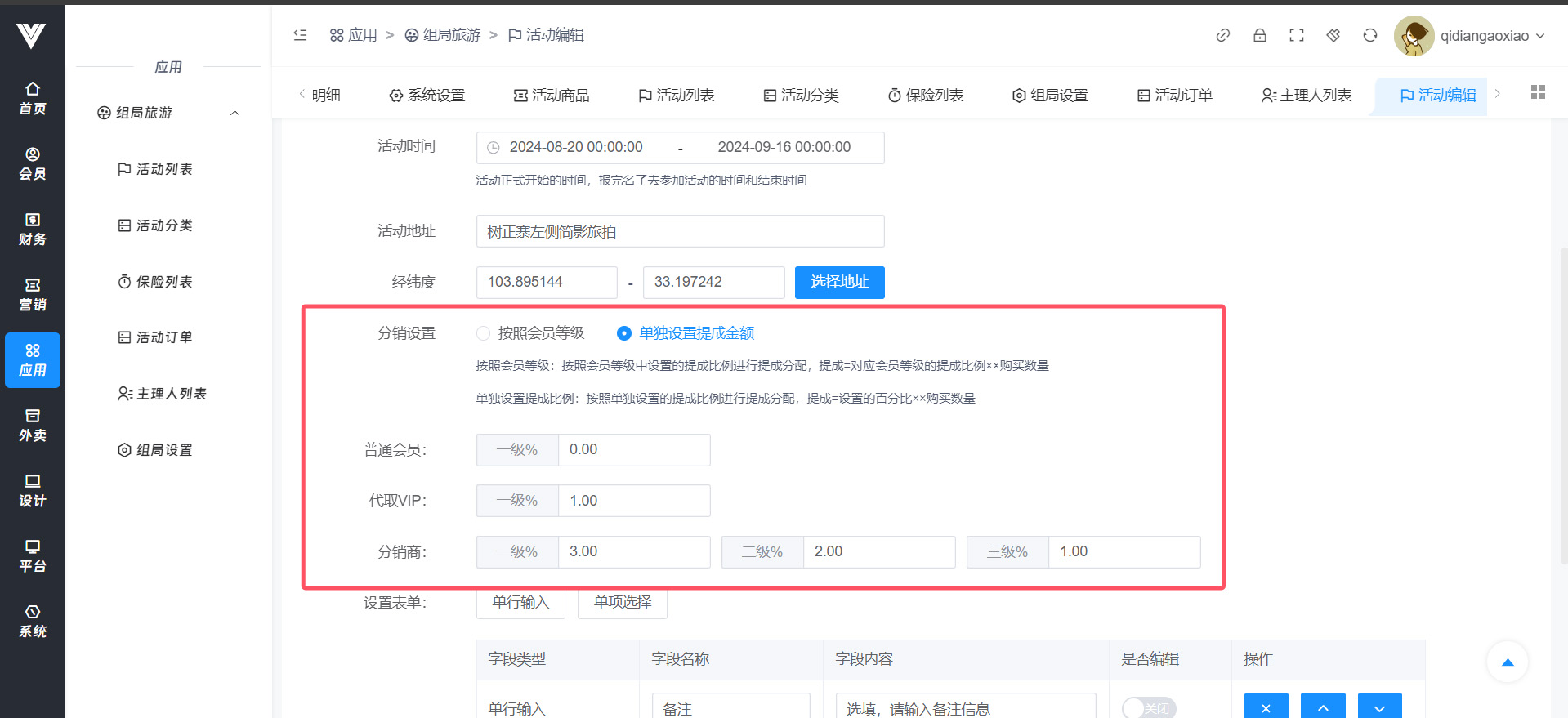 **活动列表** 在此处创建和管理组局活动,同时用户在小程序申请发布的活动也是在此处审核,如果要在小程序发布活动需要先申请成为主理人才可以  点击添加之后活动详细设置如图  设置时输入活动的基本信息,包括活动名称,活动类型是组局还是旅游,活动的图片,群聊的图片,活动分类需要在左边活动分类添加之后才可以才此处选择,在主持人id处填写主持列表内的id,活动地址处点击选择地址进行地址选取 接下来就可以设置分销了,可以设置按照会员等级或者单独设置提成金额 按照会员等级设置如下  单独设置提成金额如下  表单设置可以多样化设置用户输入的内容,如图所示  上架和下架是让活动是否显示在用户小程序界面 设置好此组局的销量之后点击提交即可创建活动了 要想让活动在用户界面正常显示,在后台添加的活动需要添加分组和子分类,在活动列表里面点击分组之后,如下图所示  组局活动点击添加,把分组名称,活动人数,活动价格,描述,角标,选择保险和截止时间,点击提交之后即可  旅游模块除了上面这些之外,还要点击子分类添加,如下图所示  角标添加之后在用户界面的显示如图所示