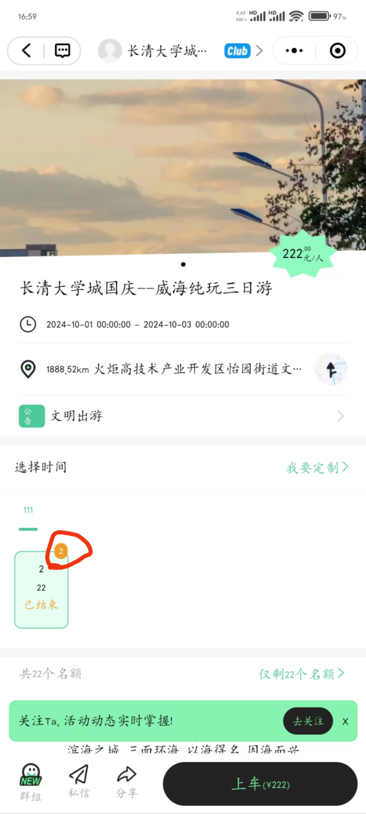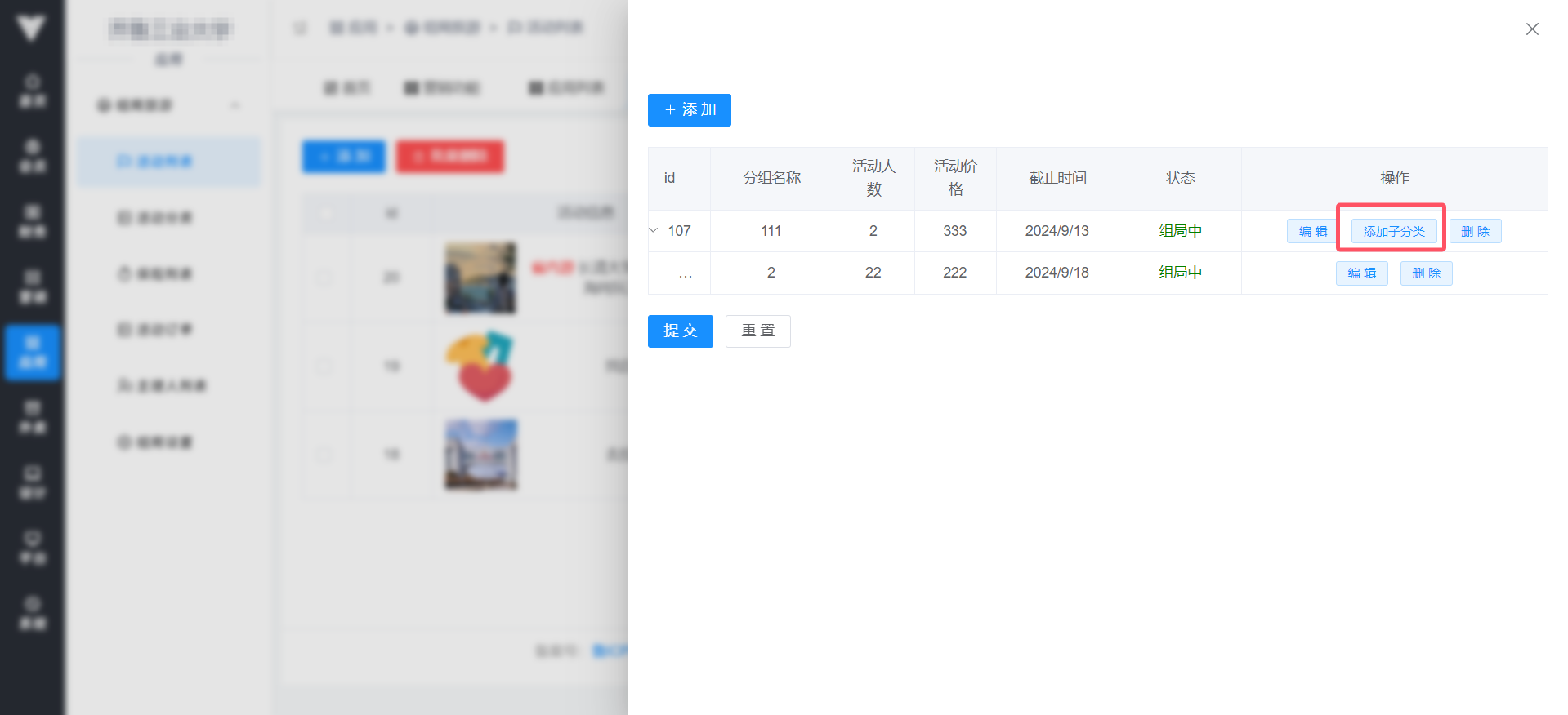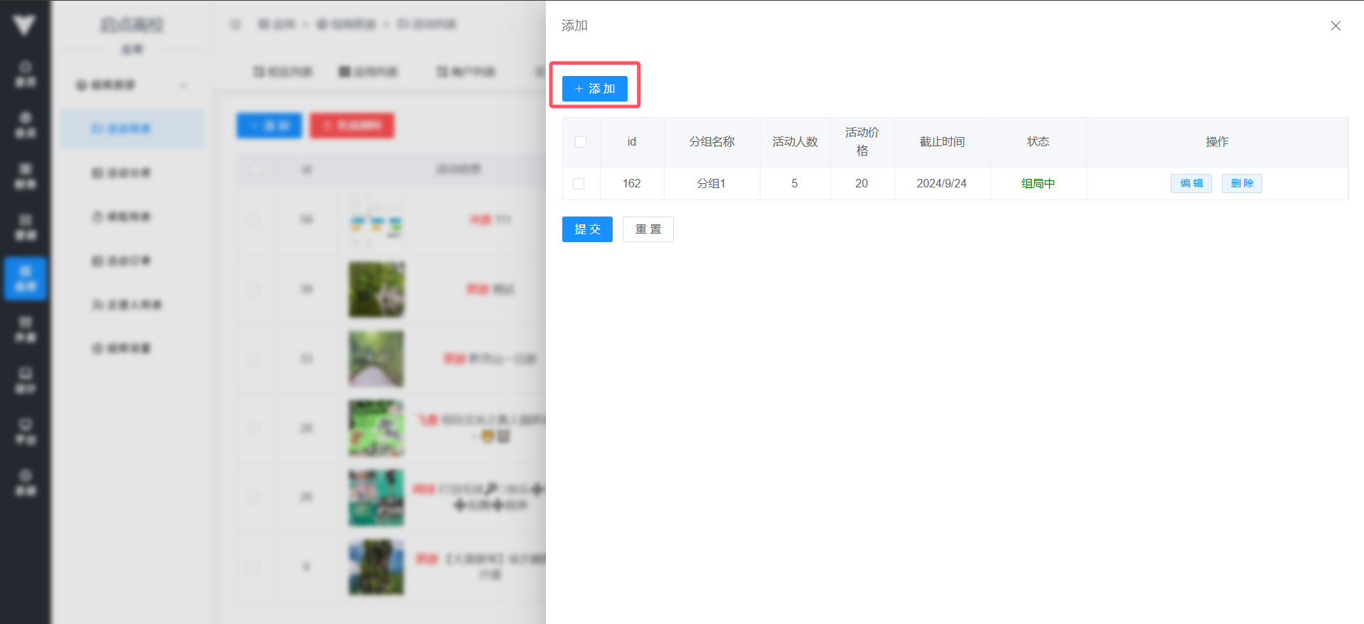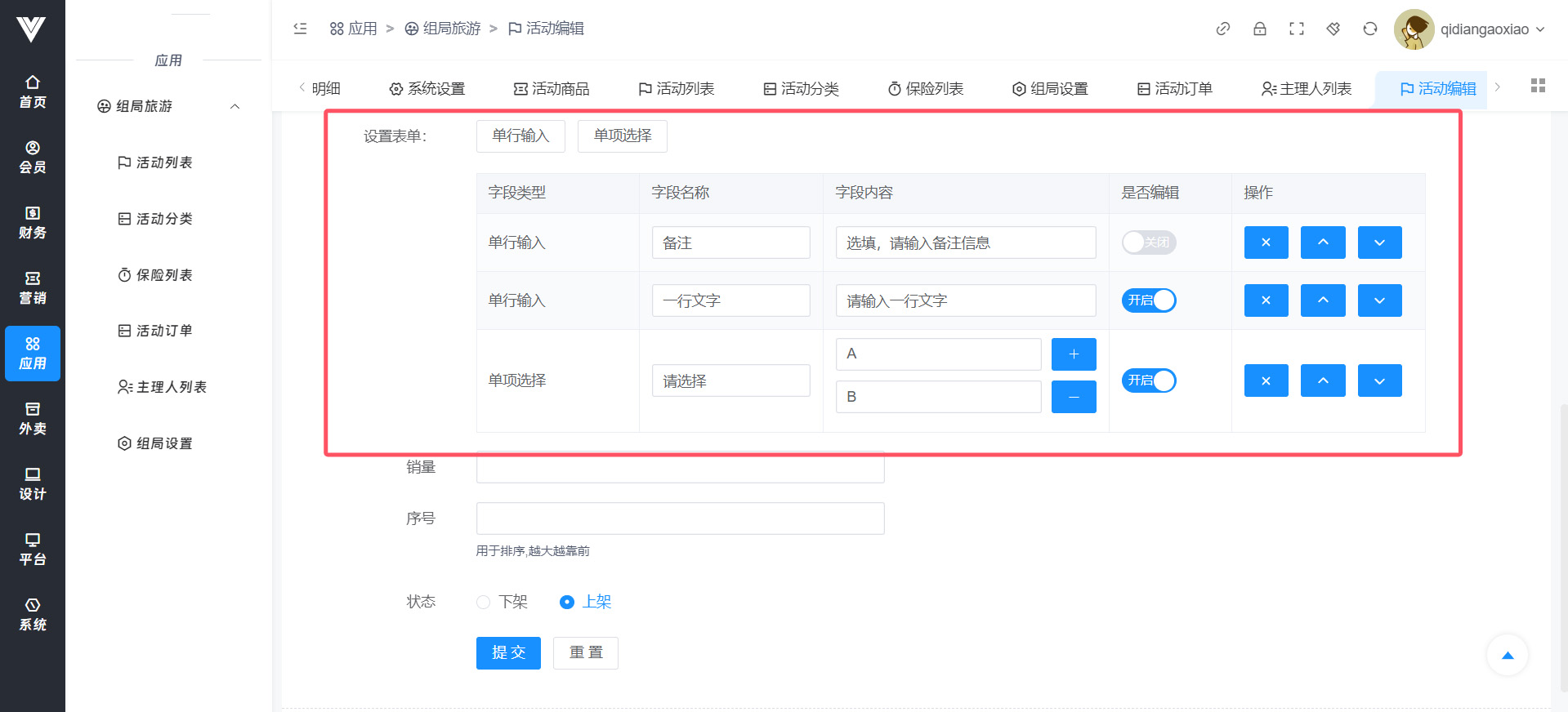 **活动列表** 在此处创建和管理组局活动,同时用户在小程序申请发布的活动也是在此处审核,如果要在小程序发布活动需要先申请成为主理人才可以  点击添加之后活动详细设置如图  设置时输入活动的基本信息,包括活动名称,活动类型是组局还是旅游,活动的图片,群聊的图片,活动分类需要在左边活动分类添加之后才可以才此处选择,在主持人id处填写主持列表内的id,活动地址处点击选择地址进行地址选取 接下来就可以设置分销了,可以设置按照会员等级或者单独设置提成金额 按照会员等级设置如下  单独设置提成金额如下  表单设置可以多样化设置用户输入的内容,如图所示  上架和下架是让活动是否显示在用户小程序界面 设置好此组局的销量之后点击提交即可创建活动了 要想让活动在用户界面正常显示,在后台添加的活动需要添加分组和子分类,在活动列表里面点击分组之后,如下图所示  组局活动点击添加,把分组名称,活动人数,活动价格,描述,角标,选择保险和截止时间,点击提交之后即可  旅游模块除了上面这些之外,还要点击子分类添加,如下图所示  角标添加之后在用户界面的显示如图所示