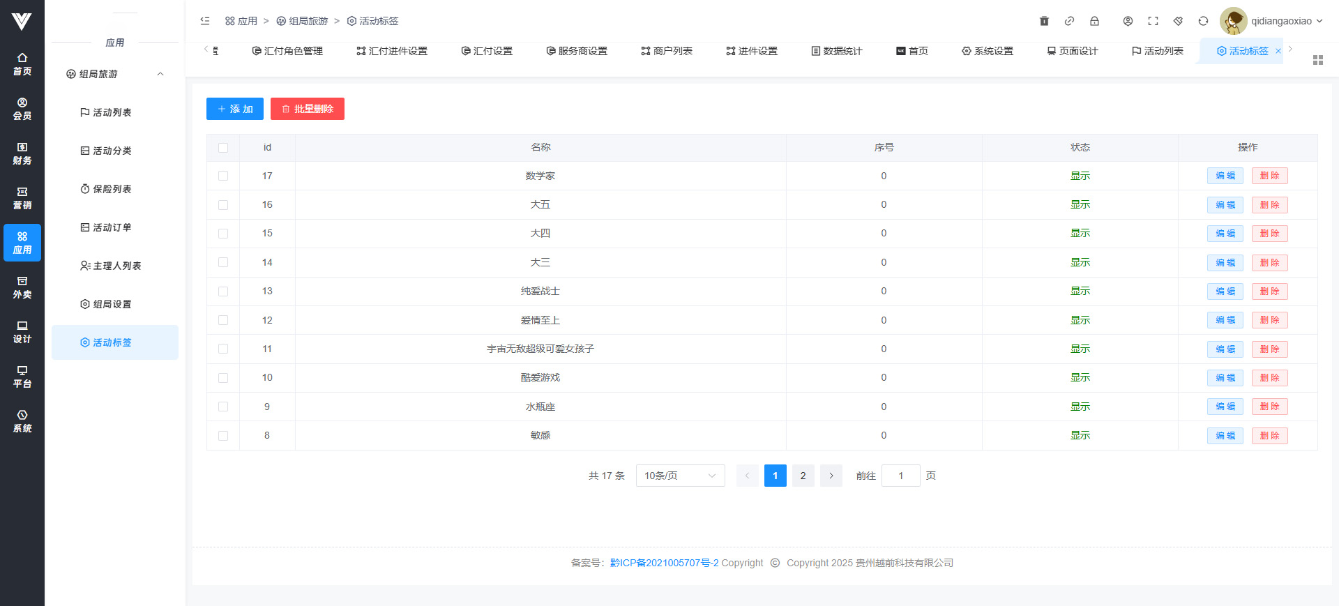 此处可以设置对应的活动标签供主理人创建活动时候使用,可直接添加或者批量删除