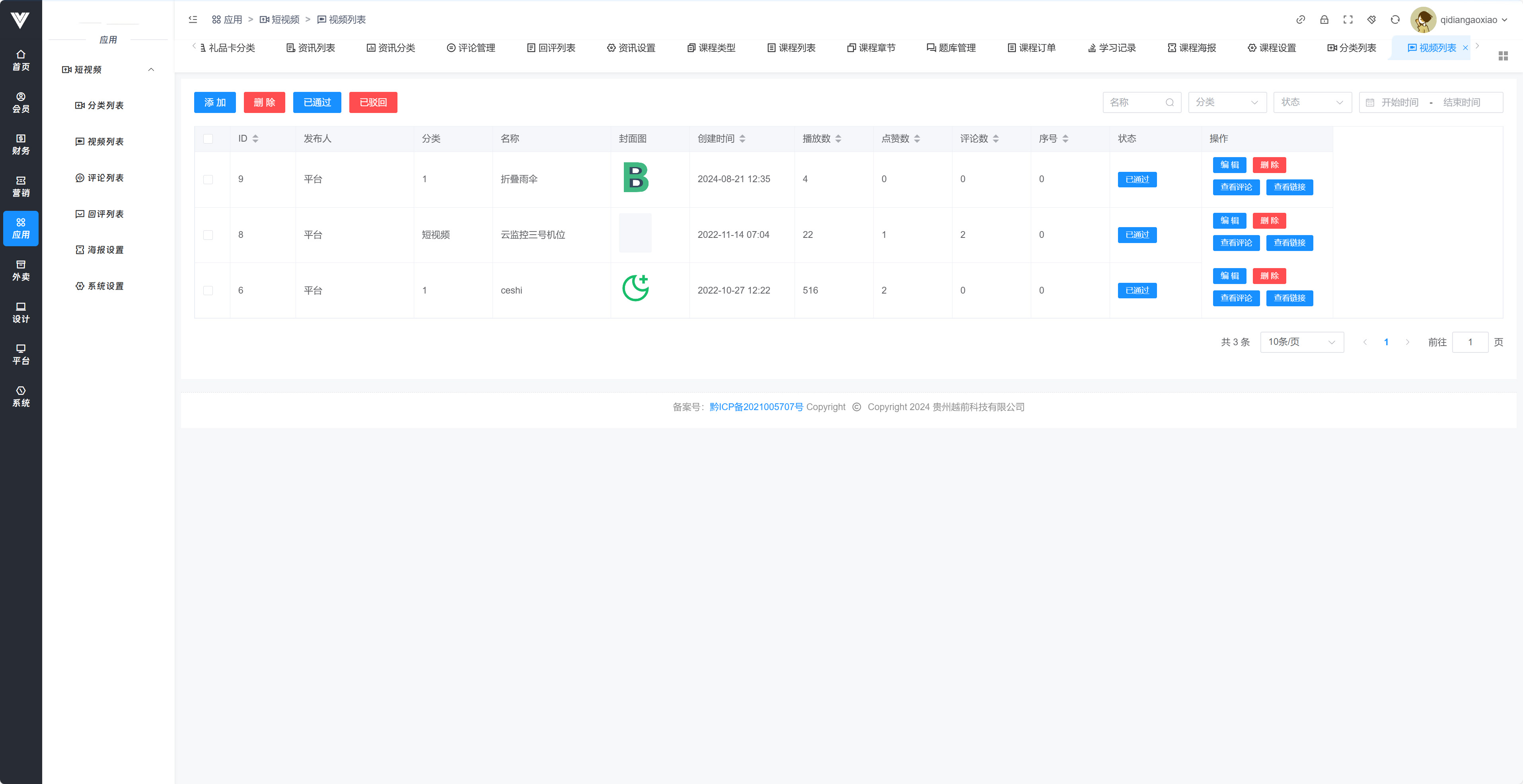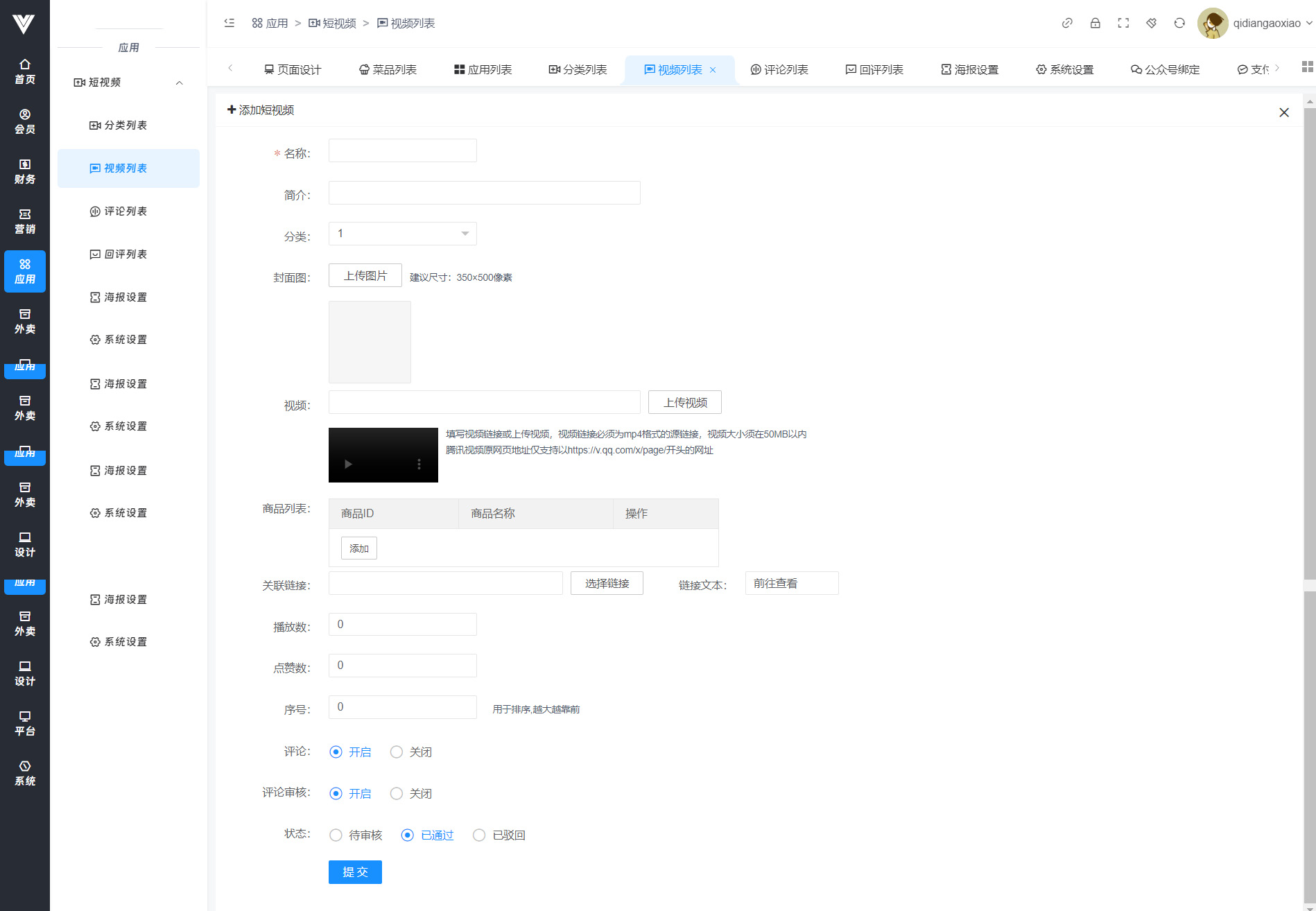 **视频列表** 在此处添加短视频并进行管理  点击添加之后详细设置如图,按照图中所示信息设置完成即可
