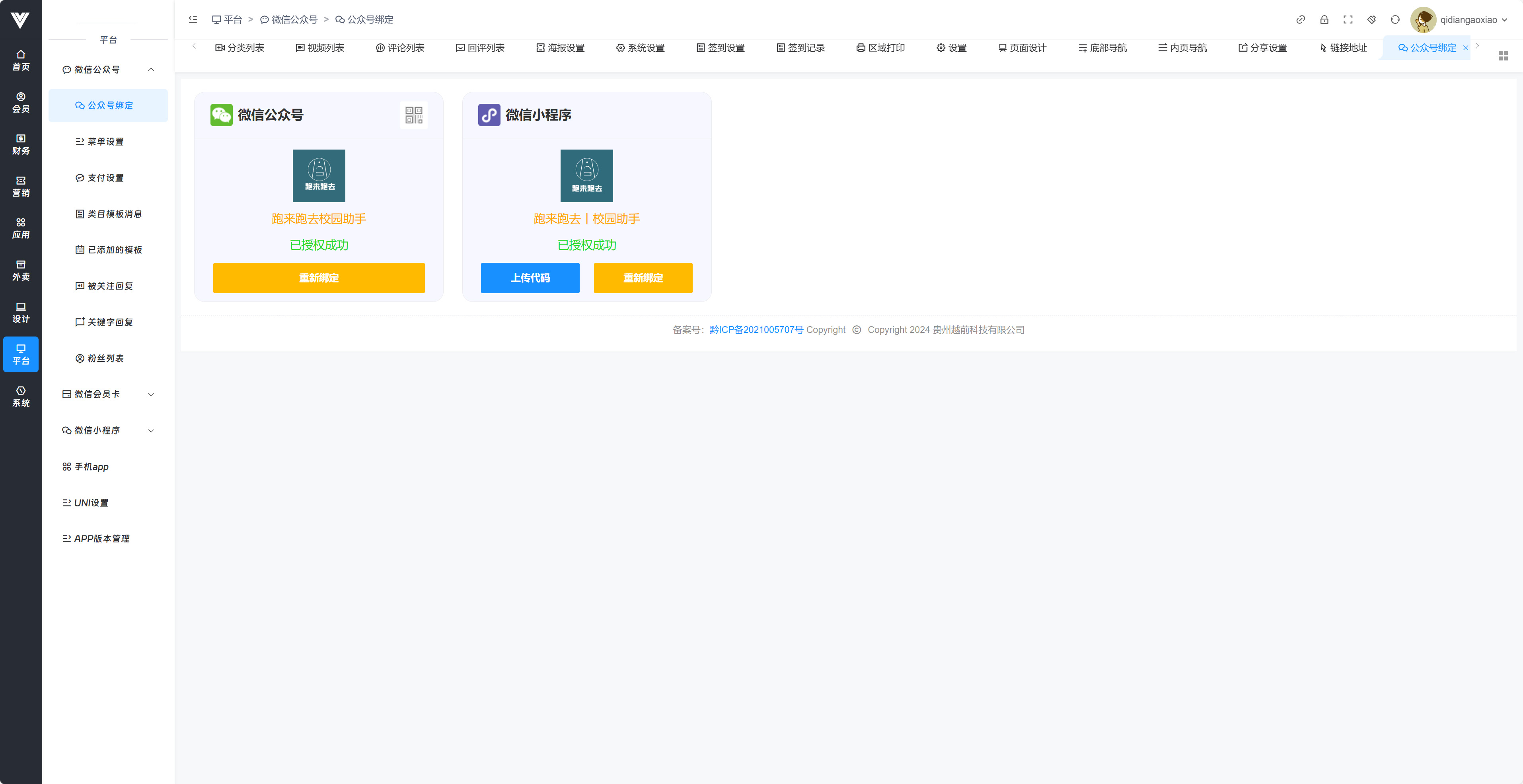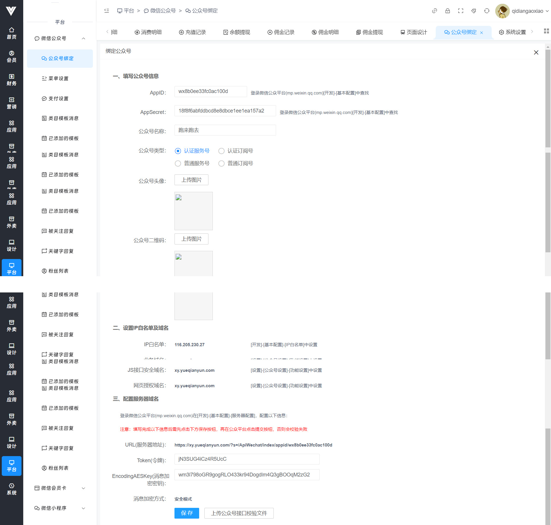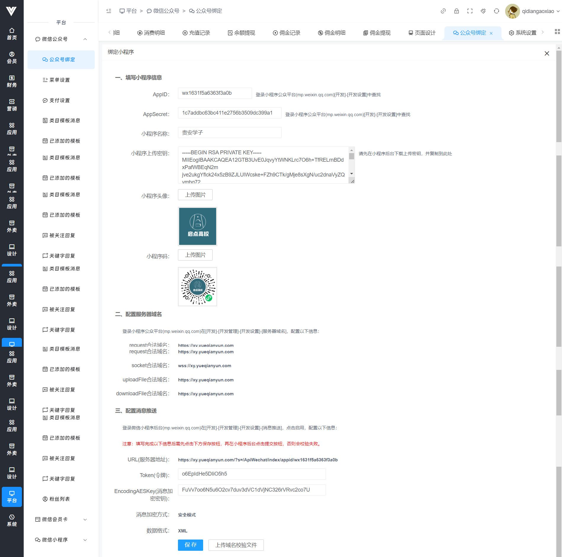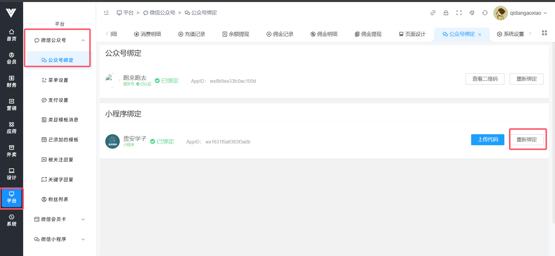 **公众号绑定** 在此处做公众号绑定操作  点击重新绑定,根据下图信息提示完成配置  **小程序绑定**  点击重新绑定,进行小程序绑定,根据下图信息提示完成配置