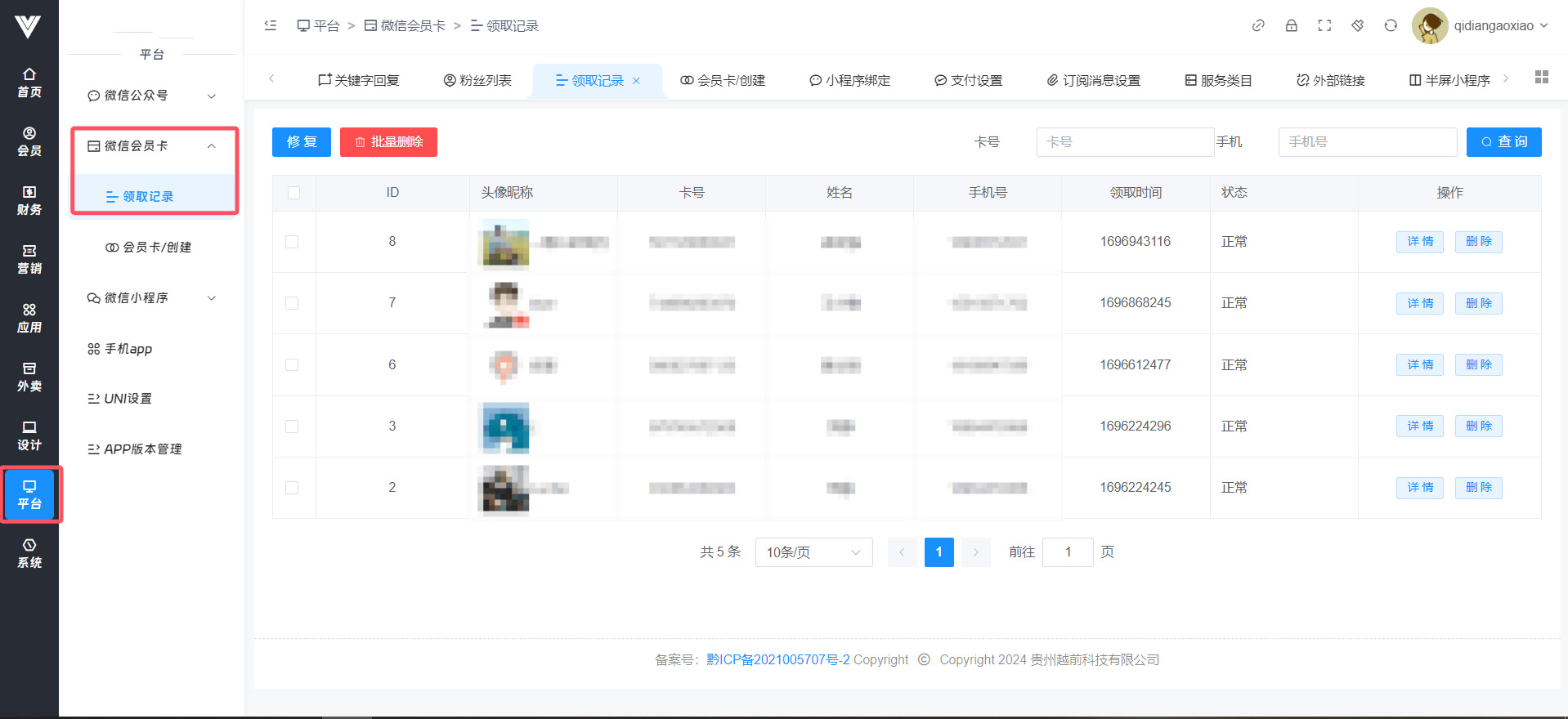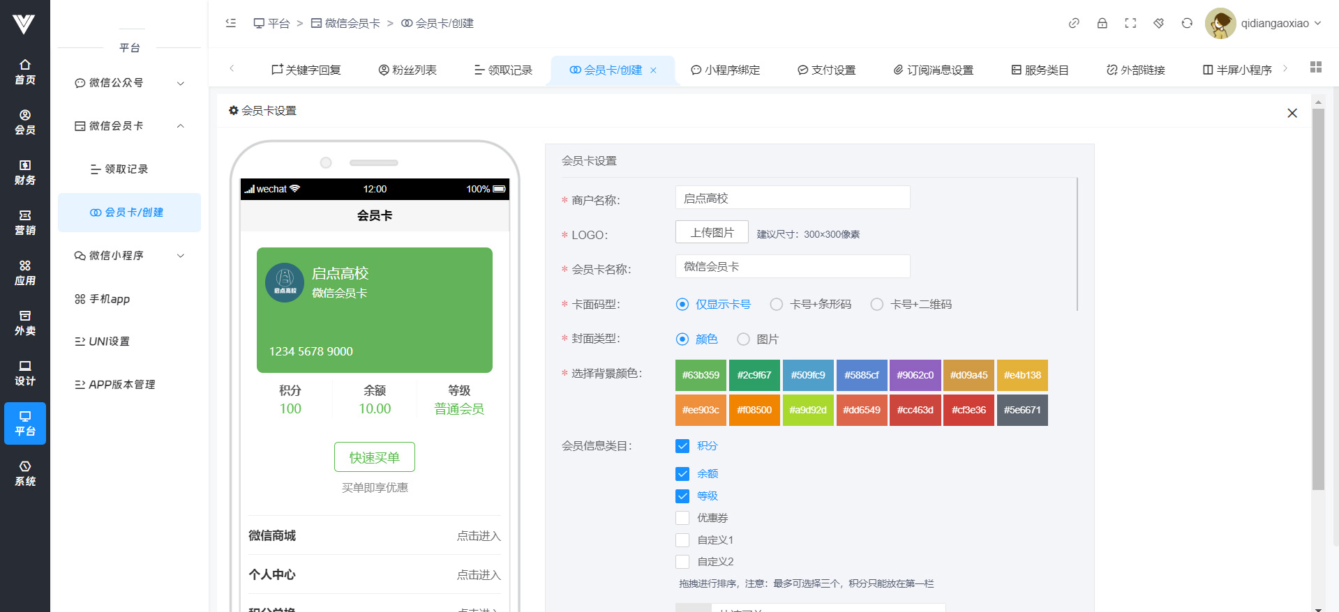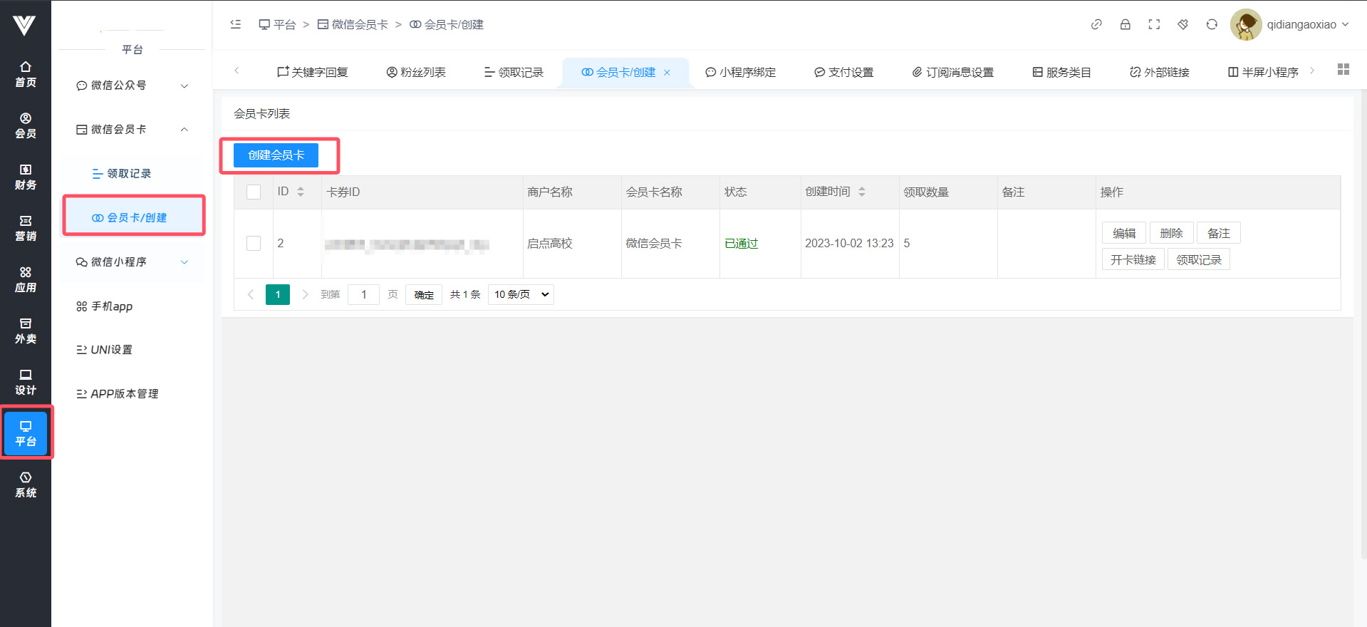 **领取记录** 在此处查看领取微信会员卡的用户  **会员卡创建**  点击创建会员卡进行会员卡创建,按照需求设置好即可