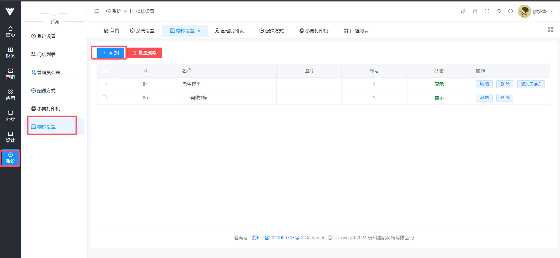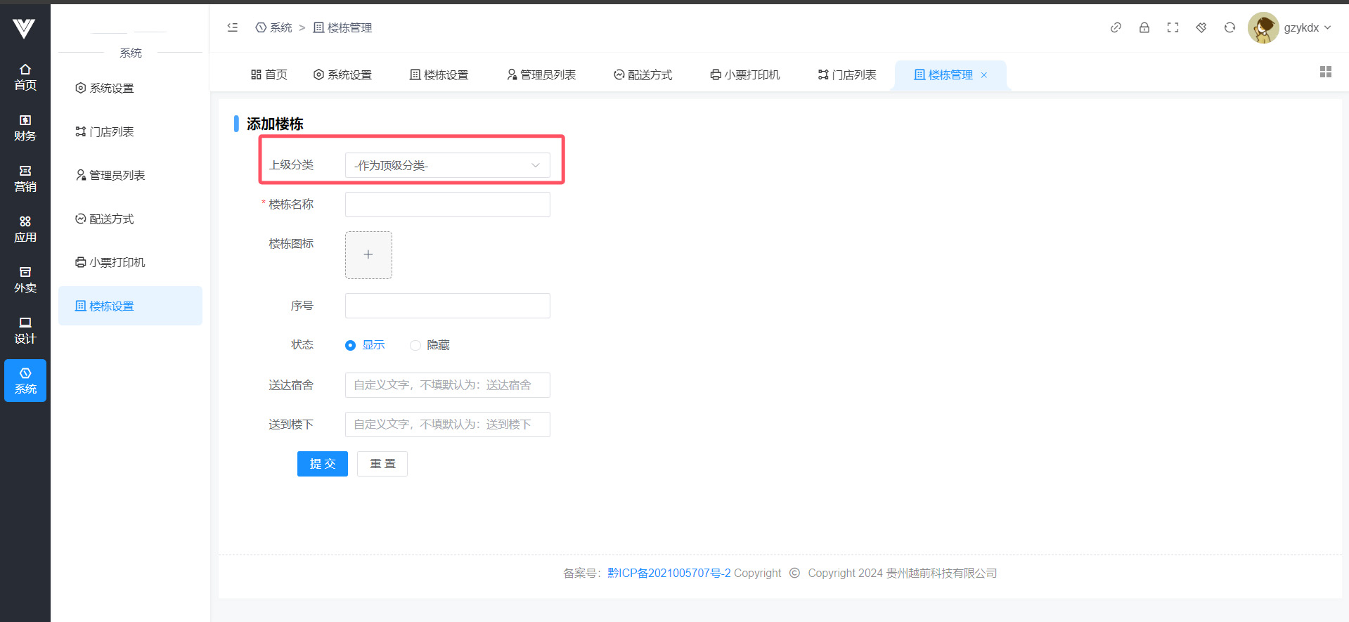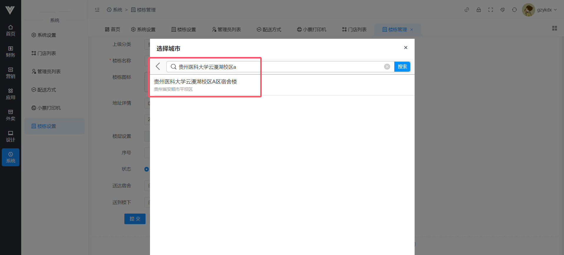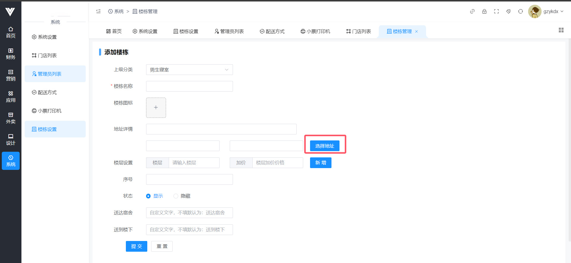 **楼栋设置** 在此处进行楼栋位置设置,否则会导致无法下单  点击添加之后,先设置一个顶级分类,比如男生寝室,送到宿舍和送到楼下的文字可以自定义  随后在顶级分类下添加子分类,点击之后,点击选择地址进行楼栋的详细地址选择,并进行命名,例如男寝1栋,设置完毕即可让用户在下单选择地址时候选择此楼栋,注意,一定要点选择地址进行地址设置,否则在用户端选择此楼栋之后地址显示会有问题