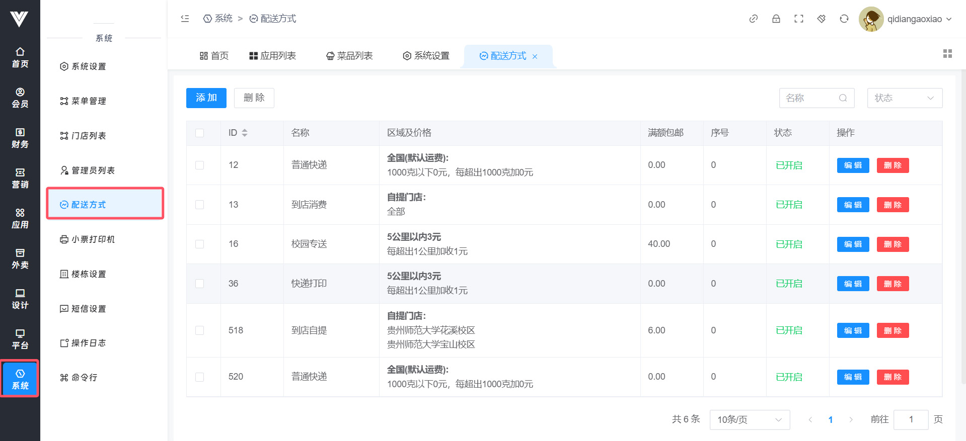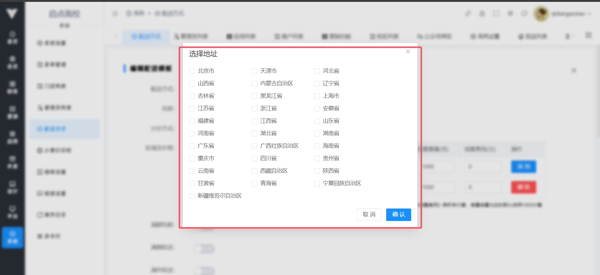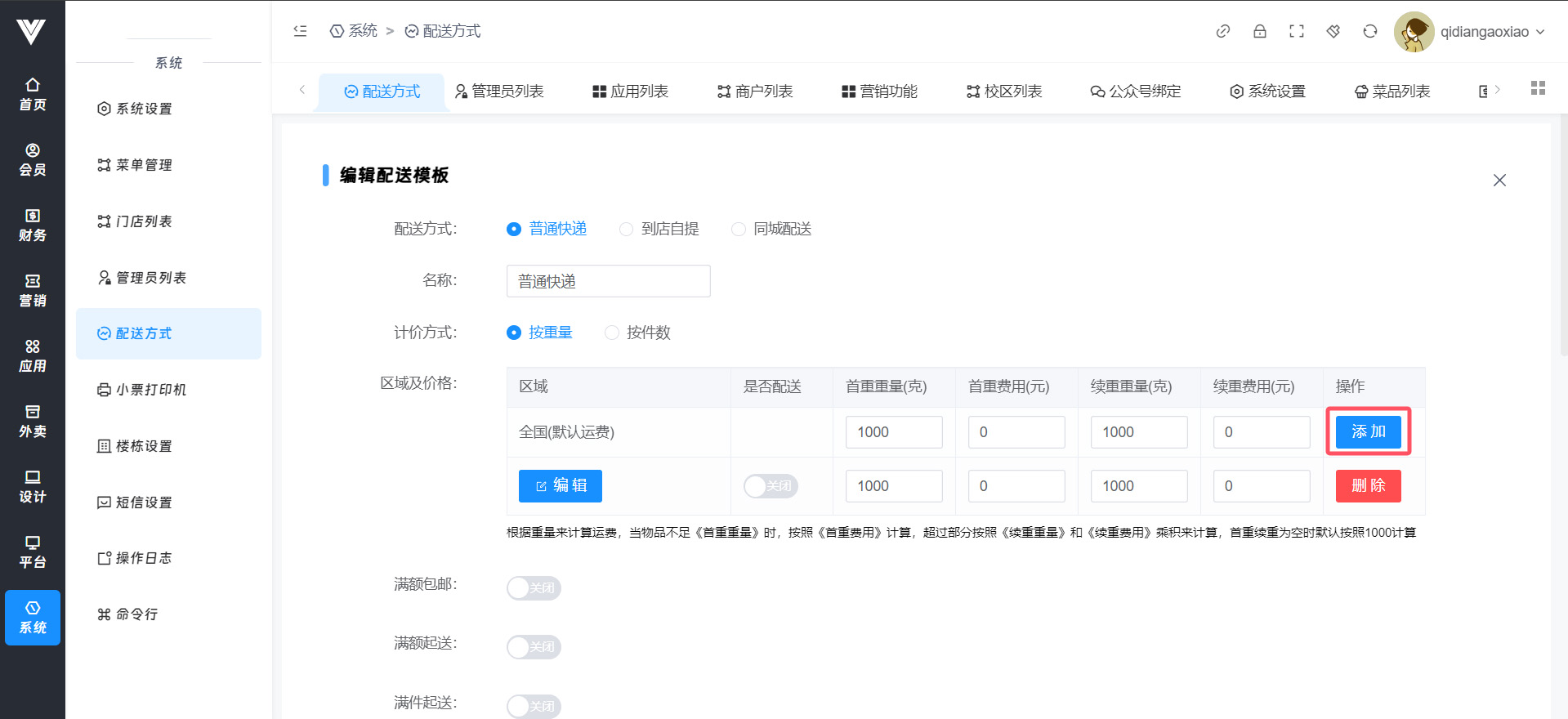 此处进行的配送方式是模板,可以在商城团购添加及编辑商品时进行选择模板,注意,此处配送方式和外卖→外卖设置→配送方式是没有关联的  点击添加之后可以自由设置配送方式,有三种配送方式可以选择  普通快递的方式可以自由选择配送国内哪些省份,需要点击操作处的添加按钮,如下图所示  点击添加之后会新加一行,点击这一行头部的编辑之后可以选择配送到哪个省份,如下图所示
