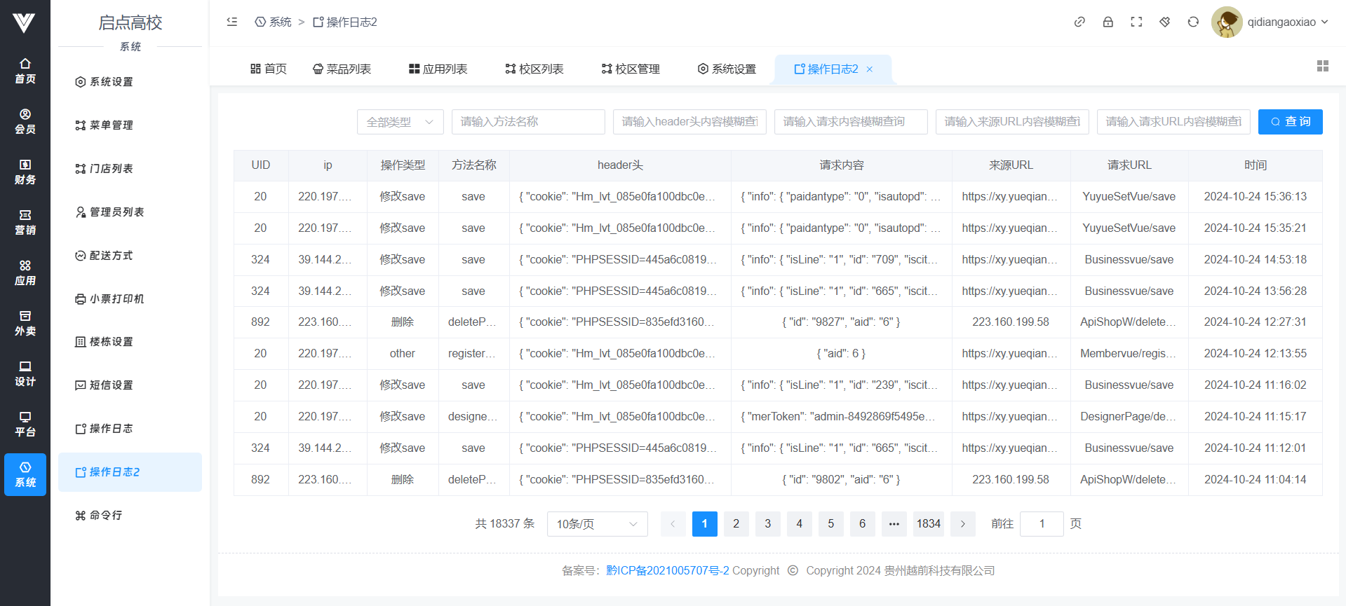 此处看到的是对系统的详细操作记录  可以查看操作产生的IP地址,查询是在哪个地方产生操作的 可以查看操作类型是删除还是修改保存 可以查看调用了哪个方法 可以查看本次操作产生的接口header 可以查看请求的内容 可以查看请求来源的URL 可以查看请求URL 可以查看产生修改的时间