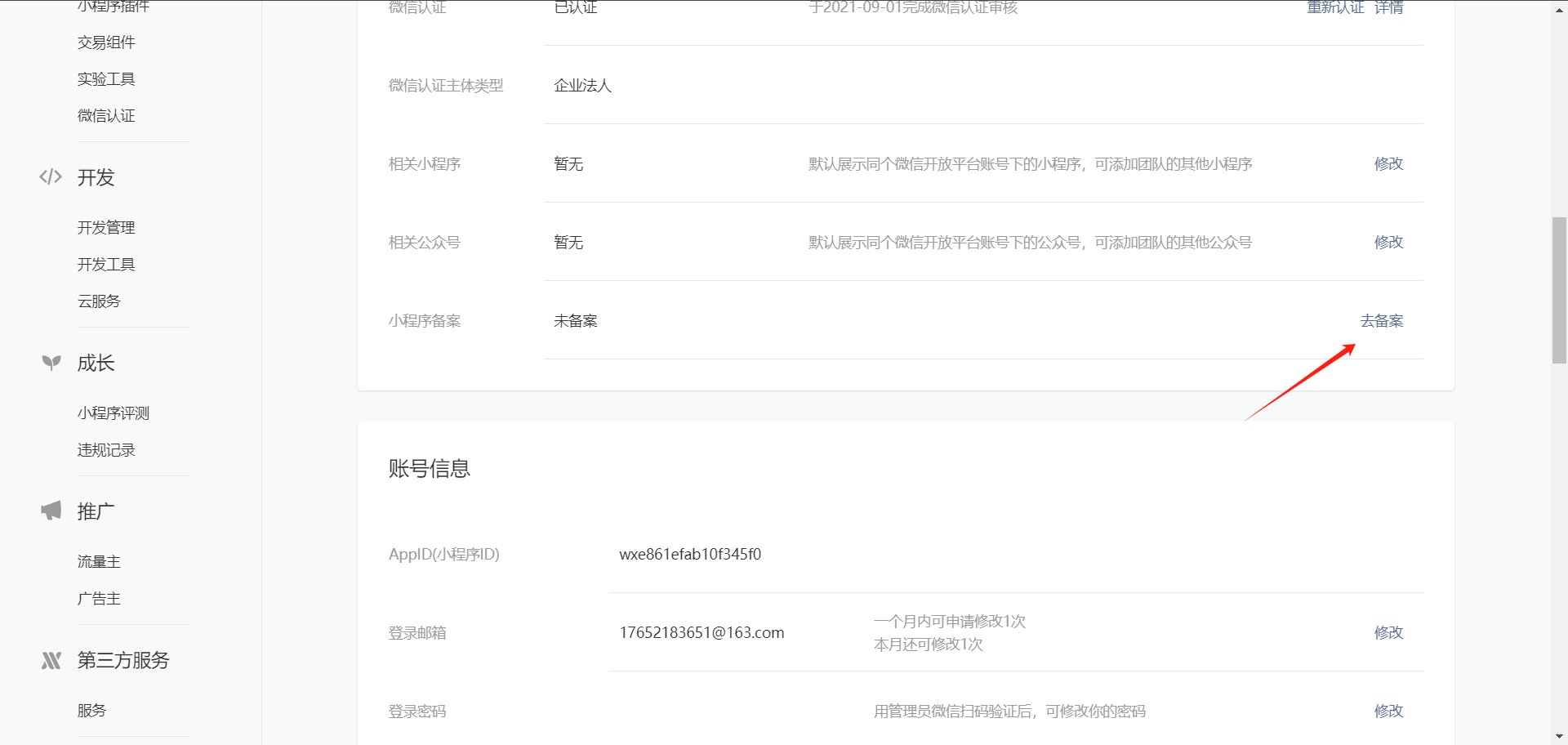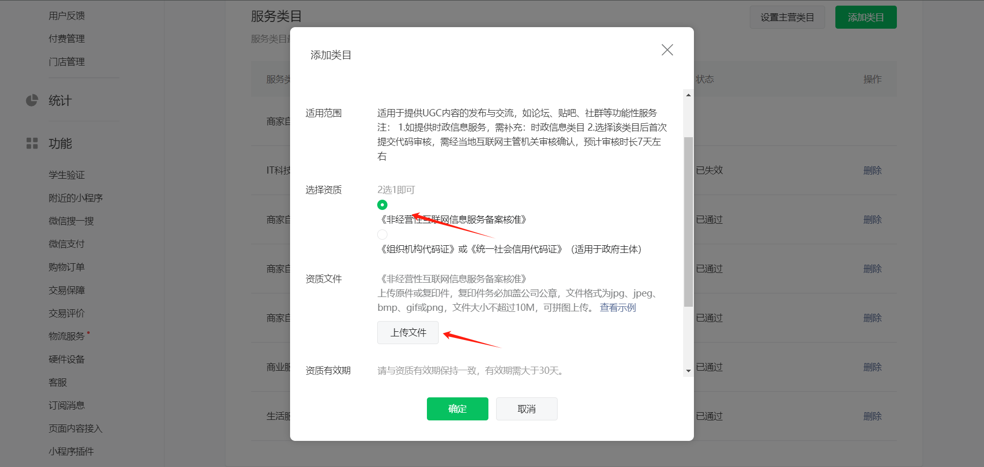 #### **现在所有的小程序都被要求必须备案**  #### ****域名备案的作用****:如果需要使用论坛的站内信息提醒,需在小程序后台添加社交 > 社区/论坛类目,添加这个类目   #### 添加这个类目需要域名备案截图  #### 域名备案 ICP备案分为经营性备案和非经营性网站备案,经营性备案会下发ICP许可证,也就是增值电信业务许可证,而非经营性备案就是ICP网站备案,一般只有一串备案号。一般性企业官网只需备案网站即可,无需办理ICP许可证的。 备案的目的就是为了防止在网上从事非法的网站经营活动,打击不良互联网信息的传播,如果网站不备案的话,很有可能被查处以后关停。非经营性网站自主备案是不收取任何手续费的。 需要准备的资料(企业备案) 1.主办单位名称 注:如果是个人网站的,就填名字; 如果是企业网站的,就填公司名称。 2.主办单位有效证件号码 注:如果主办单位名称是个人名字的,就填身份证号码; 如果是公司的,那么就写营业执照号码。 3.主办单位性质 注:填写企业、个人、事业单位。 4.主办单位通信地址 注:一定要写清楚哪个省、市、街、号地址一定要详细。 5.有效证件类型 注:填写身份证、护照或台胞证。 6.网站负责人姓名、电话、有效证件号码、邮箱 7.网站名称、网站域名 备案流程 1.注册域名 选择一家服务区域涵盖的域名服务商,注册网站所需域名。 2.域名实名认证 注册域名后,需要对域名进行实名认证。(注:域名的实名认证主体需与网站备案主体一致,如某某公司网站备案,那么域名实名认证也需要用某某公司的名义)。 3.获取备案码 在域名服务商处,租赁服务器,获取网站备案码。 4.填写备案信息 根据页面提示,填写主体信息(公司名称、营业执照、联系人等)、备案网站信息(网站域名、服务器IP地址、备案码、网站简介等),管局审核时间一般为3-15个工作日。 5.完成工信部短信核验 提交备案信息后,会收到来自工信部的核验短信,需完成短信核验后,该网站备案申请才会提交成功。按页面要求填写相应信息即可。 6.备案完成 网站备案成功后,会通过短信、邮箱等方式将备案号发送给您。当网站上线时,需要将网站备案号放置于网站底部。