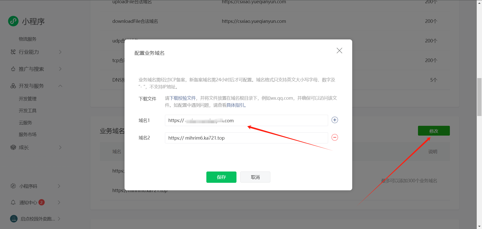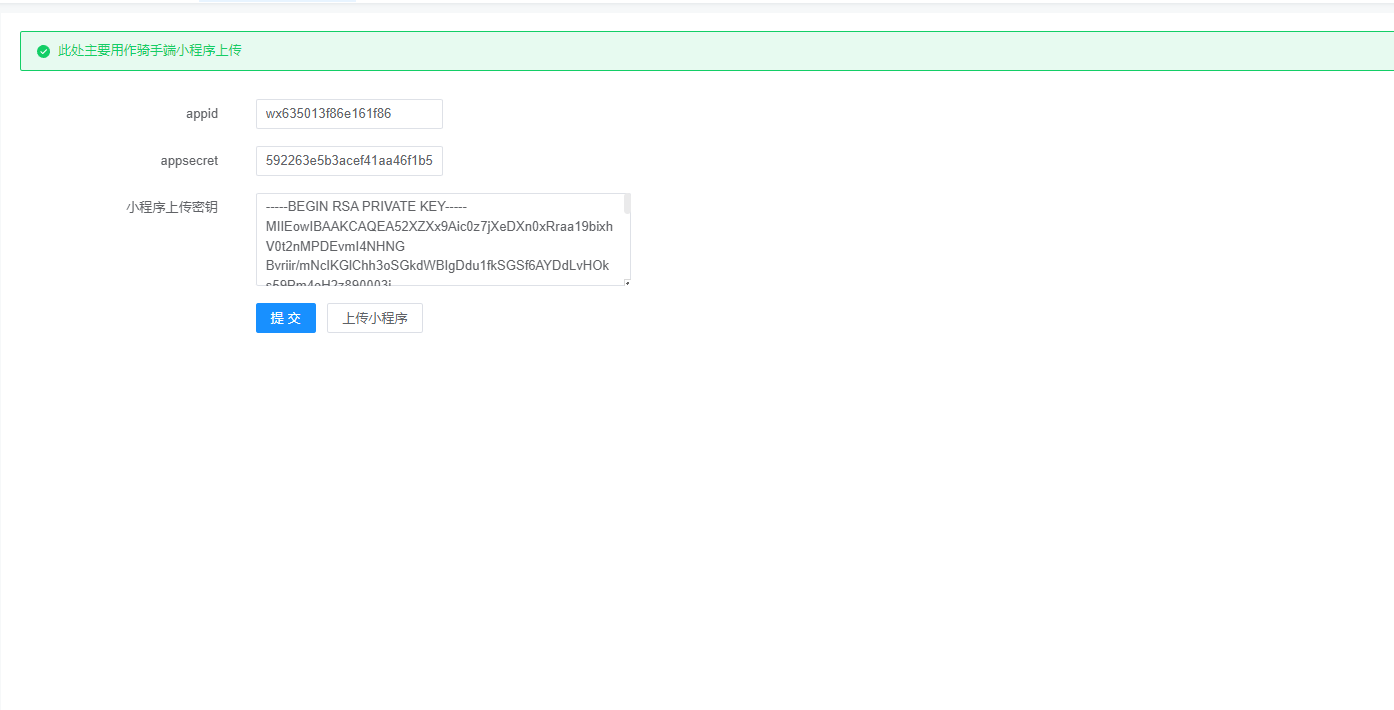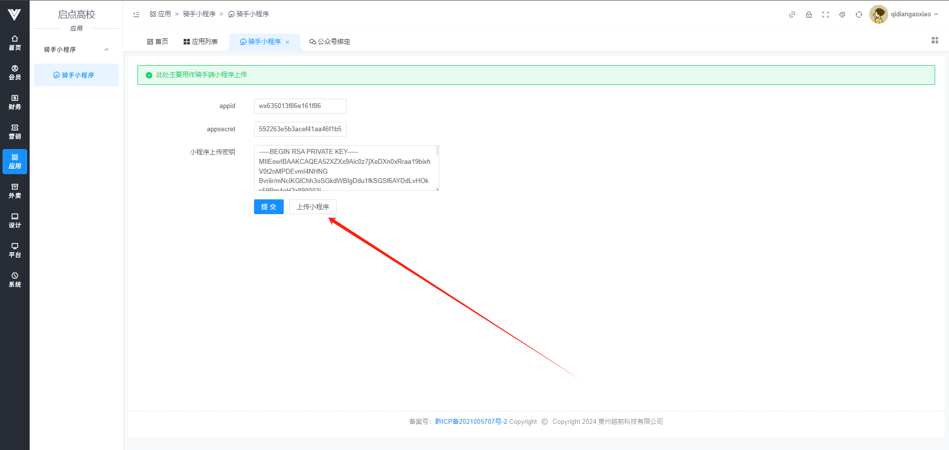 #### **商家端与小程序端的步骤一样** #### 首先登录小程序找到**开发管理**菜单进去,配置服务器域名,配置四个,**注意看截图,用自己的域名!!!** [https://加你自己的域名](https://yepynn6rxo.k.topthink.com/@1epkkmn7pd/qishouduanxiaochengxushangchuan.html#!) wss://加你自己的域名  #### **配置业务域名(你自己的域名),下载校验文件上传,步骤:平台---绑定小程序--上传--保存,保存之后再回到小程序业务域名配置这里保存**    #### **点击要上传的小程序端**  #### ****对应需要填写的内容去登录小程序平台---开发管理****   #### ******上传点击生成,复制到上面截图里****** #### **appid和appsecret**  #### **小程序上传密钥**  #### **信息填好之后,保存,然后上传小程序代码**  #### **上传成功后,登录小程序----版本管理---提交审核。其他什么都不填,注意!!!只需要填商家账号或骑手账号(自己在后台添加一个骑手或商家账号)**    #### **注意看文字说明,截图!!!!!!**