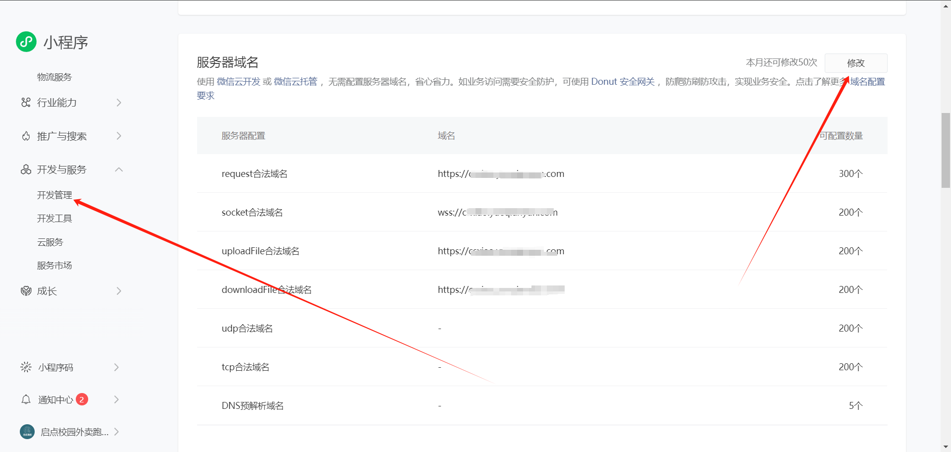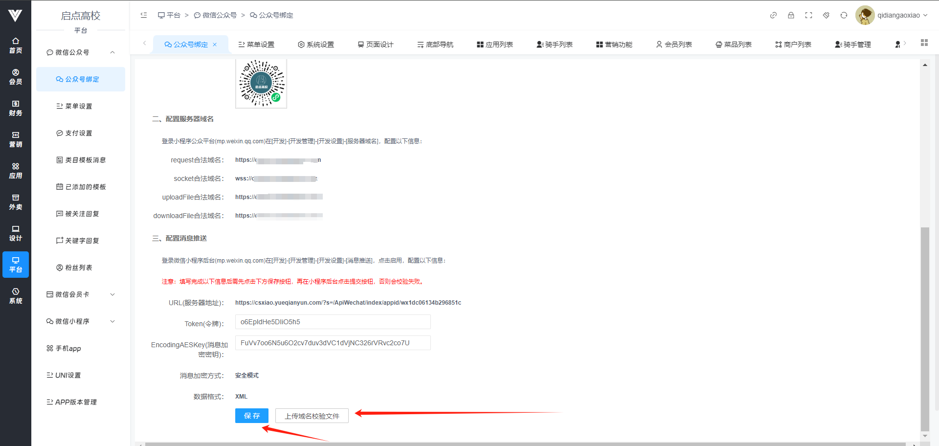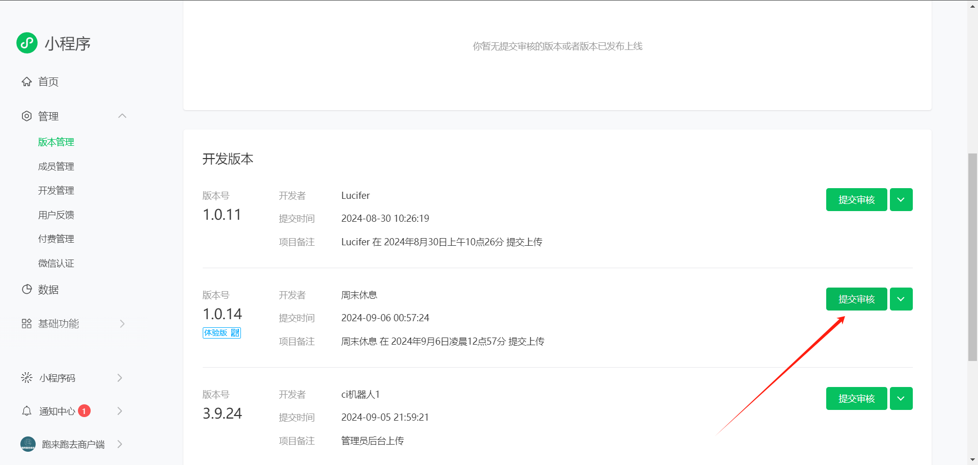 #### **商家端与小程序端的步骤一样** #### 首先登录小程序找到**开发管理**菜单进去,配置服务器域名,配置四个,**注意看截图,用自己的域名!!!** [https://加你自己的域名](https://yepynn6rxo.k.topthink.com/@1epkkmn7pd/qishouduanxiaochengxushangchuan.html#!) wss://加你自己的域名  #### **配置业务域名(你自己的域名),下载校验文件上传,步骤:平台---绑定小程序--上传--保存,保存之后再回到小程序业务域名配置这里保存**    #### **点击要上传的小程序端**  #### ****对应需要填写的内容去登录小程序平台---开发管理****   #### ******上传点击生成,复制到上面截图里****** #### **appid和appsecret**  #### **小程序上传密钥**  #### **信息填好之后,保存,然后上传小程序代码**  #### **上传成功后,登录小程序----版本管理---提交审核。其他什么都不填,注意!!!只需要填商家账号或骑手账号(自己在后台添加一个骑手或商家账号)**    #### **注意看文字说明,截图!!!!!!**