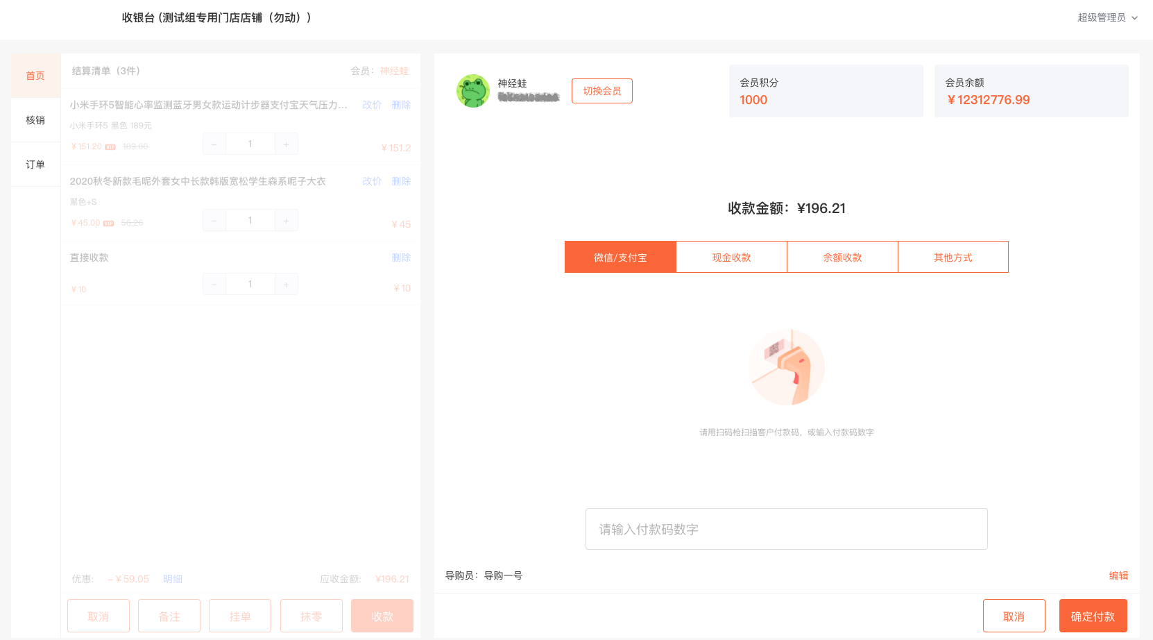 ### 一:功能介绍 收银台为PC版收银,支持多门店,每个门店有独立的收银台。收银台打通线上线下,支持多种营销活动。 ### 二:场景举例 店铺A既有线上商城,也有线下门店。商城会员到店消费时,商家用收银台结账,结算时可通过手机号或扫会员码登陆会员,该会员即可享受商品会员价和营销折扣。结算成功后,可统计收银员提成。 ### 三:功能路径 业务端后台 - 应用 - 收银台 ### 四:功能说明 (1)收银台设置 参与营销:营销活动支持优惠券、满额立减、积分抵扣、折扣、充值奖励、消费奖励、新人礼、打包一口价和第N件打N折。 若收银台需要支持营销活动,则该参数选择开启,并且创建营销活动时,支持渠道需要勾选收银台。 关联导购:启用后,下单时可以选择该单的导购员,并可统计导购提成。 自动打印小票:开启后,收银台订单付款后自动打印小票。 打印交班小票:开启后,收银员交班时,可以打印交班小票。需要在小票打印处,先设置交班小票模板和打印机。 支付设置:收银台支付方式支持微信和支付宝扫码支付、余额支付、现金支付和其他支付。 抹零设置: 抹零方式分为4种,抹分、抹角、四舍五入到角和四舍五入到元。开启自动抹零后,结算时会根据设置自动将结算金额抹零。 提成:系统支持统计收银员和导购员提成,提成比例支持统一比例,也可针对收银/导购人员单独设置。 PS:店铺开启多门店后,门店有自己专属收银台,需要门店单独设置本门店的收银台。   (2)有收银权限的账号才可以登录收银台,登录成功后,若店铺开启了多门店,账号有多家门店权限,登录之后需要选择收银门店。   3)收银台开单 1. 可通过搜索商品名称、商品分类和用扫码枪扫描商品条形码查找商品。 收银台可以结算的商品为该门店可售的实体商品,虚拟商品、卡密和计次时商品暂不支持收银台售卖。   2. 结算清单 结算清单显示加购的商品,会员登录后商品价格显示会员价。 结算清单中可以直接修改商品数量。 改价:点击可以修改商品价格,修改成功后,结算清单中商品价格显示为改价后的价格。 删除:点击可以删除已选择的商品。 优惠明细:可以查看优惠方式和优惠金额。 取消:点击清空结算清单,重新结算商品。 备注:可对当前结算订单进行备注。 挂单:点击可将结算清单中的商品挂单。 抹零:按照收银台设置的抹零方式进行抹零。 收款:生成订单进行结算,左侧结算清单区域不可再编辑。 直接收款:点击直接收款,输入收款金额,结算清单中会生成一个直接收款的临时商品。直接收款商品不参与营销活动。    3.选择会员 收银台可以通过输入会员手机号或扫描会员码绑定会员。 若手机号还不是商城会员时,可快速为其办理新会员。 绑定会员成功后,可在会员界面给会员进行充值余额和充值积分操作。 点击切换会员,可退出当前会员重新绑定。    4.优惠活动 优惠活动界面,显示收银台正在参与的营销活动,点击查看可以查看活动详情。 结算清单绑定会员后,结算商品自动参与优惠活动。 若有正在进行的积分抵扣活动,在会员界面,可以选择是否使用积分抵扣优惠。   5.取单 取单界面展示正在挂单的结算订单,点击取单后继续进行结算。取单时若有正在结算的商品,则该商品自动挂单。  (4)结算 1. 选择导购 当收银台开启导购功能后,在结算时,可以选择该单的导购。  2. 结算支持微信、支付宝扫码支付、现金收款、余额收款和其他方式收款。 微信/支付宝支付:用扫码枪扫描会员付款码即可完成支付。 现金支付:输入收款金额,点击确定即可完成支付。 余额支付:使用会员账户余额进行付款。 其他方式支付:若会员通过扫描商家收款二维码等其他方式付款后,可以选用该方式进行结算。 3. 收款成功后,点击打印小票,可以打印订单小票。 4. 结算界面点击取消,可以取消订单,可继续添加或修改结算商品。  (5)核销 核销可以核销自提订单,用扫码枪扫描二维码或输入自提码点击确定,右侧会显示该自提订单的订单详情,点击确认核销,即可核销成功。  (6)订单 订单显示收银台所有订单,可以进行备注、售后、打印小票等操作。 点击商品售后,可以对商品进行退款或退货退款。 售后退款时,退款金额会原路退回,支付方式为现金和其他方式时,退款方式默认现金退款。  7)交班 上班时间:登录时间 下班时间:确认交班时间,中途关闭收银台或退出登录均不算下班。 点击交班交班完成,退出登录。 点击交班记录,可以查看交班记录并可补打交班小票。  交班小票 在小票打印应用中设置交班小票打印模板,并配置打印机。在收银台设置中,开启交班小票打印功能。收银员交班时,可自动打印小票。也可在交班记录中,补打交班小票。