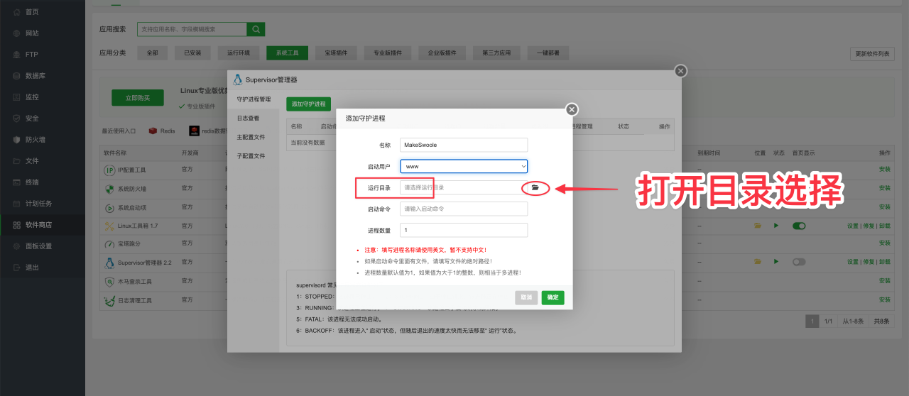 ### 宝塔环境 如果您是使用宝塔环境安装本系统,请按照本节内容操作。 ### 1. 安装并配置 Supervisor 管理器 进入终端,执行以下命令: yum install supervisor -y  进入软件商店,安装Supervisor管理器:  打开Supervisor管理器设置; 打开主配置文件,复制以下配置,替换文本框中的所有配置: [unix_http_server] file=/var/run/supervisor/supervisor.sock [inet_http_server] port=127.0.0.1:9001 [supervisord] logfile=/var/log/supervisor.log pidfile=/var/run/supervisor.pid [rpcinterface:supervisor] supervisor.rpcinterface_factory = supervisor.rpcinterface:make_main_rpcinterface [supervisorctl] serverurl=unix:///var/run/supervisor/supervisor.sock serverurl=http://127.0.0.1:9001 [include] files = /www/server/panel/plugin/supervisor/profile/*.ini  进入终端,粘贴输入并执行以下命令: pkill -9 supervisord   ### 2. 添加守护进程 打开Supervisor管理器设置; 切换到守护进程管理,点击添加守护进程:  名称填写 make-swoole;当同一台中服务器部署多套码科系统时,应配置使用不同的进程名称。 如果使用不同的进程名称,请在该系统后端根目录下的 .env 文件中配置,NAME 即为进程名,此处示例为 make-swoole-2: [SUPERVISOR] URL = "http://127.0.0.1:9001" NAME = "make-swoole-2" 启动用户选择 www:  运行目录选择后端站点根目录: 每个人的后端站点根目录都不一样,请根据自己的实际情况进行选择。   启动命令填写: /www/server/php/74/bin/php vendor/bin/easyswoole server start -mode=produce 进程数量必须是1:  填写完毕后,点击确定。 如图所示,说明守护进程成功启动:  至此操作完毕,可以继续安装后台。 ### 其他环境 如果您不是通过宝塔环境安装本系统,请按照本节内容操作。 ### 1. 安装并配置 Supervisor 安装 supervisor 软件包。 配置 supervisor (参考文档)。 确保打开 rpc 访问服务(supervisorctl 的 serverurl),码科系统将通过 rpc 控制进程。 参考以下配置: [unix_http_server] file=/var/run/supervisor/supervisor.sock [inet_http_server] port=127.0.0.1:9001 [supervisord] logfile=/var/log/supervisor.log pidfile=/var/run/supervisor.pid [rpcinterface:supervisor] supervisor.rpcinterface_factory = supervisor.rpcinterface:make_main_rpcinterface [supervisorctl] serverurl=unix:///var/run/supervisor/supervisor.sock serverurl=http://127.0.0.1:9001 [include] files = /www/server/panel/plugin/supervisor/profile/*.ini 如果使用非 9001 端口,请在码科系统后端根目录下的 .env 文件中配置: [SUPERVISOR] URL = "http://127.0.0.1:9001" NAME = "make-swoole" 其中 NAME 是 supervisor 守护的进程名,默认是 make-swoole 。当同一服务器/容器部署多套系统时,应配置使用不同的进程名称。 ### 2. 添加守护进程 添加 swoole 的守护进程,配置参考: [program:make-swoole] process_name=%(program_name)s_%(process_num)02d directory=/var/www/html command=php /var/www/html/vendor/bin/easyswoole server start autostart=true autorestart=true user=www-data numprocs=1 redirect_stderr=true stderr_logfile=/var/log/supervisor/worker.err.log stdout_logfile=/var/log/supervisor/worker.log priority=200 注意,这个启动用户 user,必须确保 php-fpm 对其产生的文件有操作权限。 将 command 命令中的 /var/www/html/ 替换为码科系统后端源码根目录的绝对路径。 必须在部署码科系统后端源码之后,才能配置 swoole 守护进程。 配置好后启动 supervisor 守护即可。