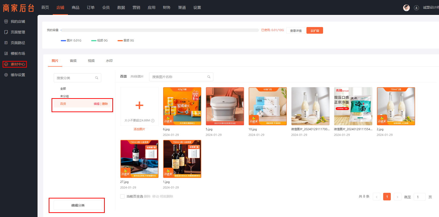 **一、功能介绍** 管理店铺所使用的的图片,音频,视频,水印等素材 **二、功能路径** ES业务端后台-店铺-素材中心 **三、功能说明** 1、创建分类 创建分类便于管理图片,音频等素材,分类可以修改名称,转移分类,删除操作。  2、上传图片 图片可以重命名,裁剪,删除功能,(ps:部分图片想在云存储里同步删除应该怎么操作呢? 素材中心左下角-彻底删除)